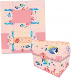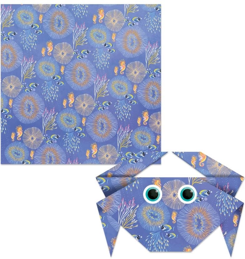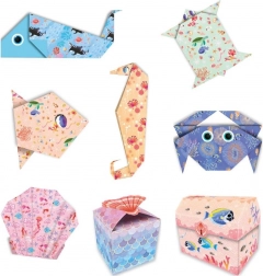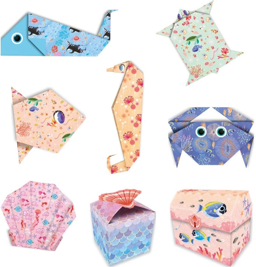 Met de voorgedrukte vellen vouw je eenvoudig visjes, een schildpad, een krab, een zeepaardje en ook kleine doosjes en schatkistjes.