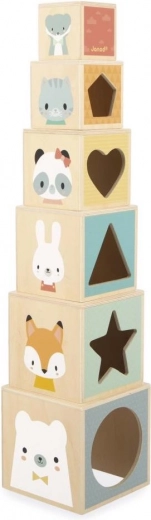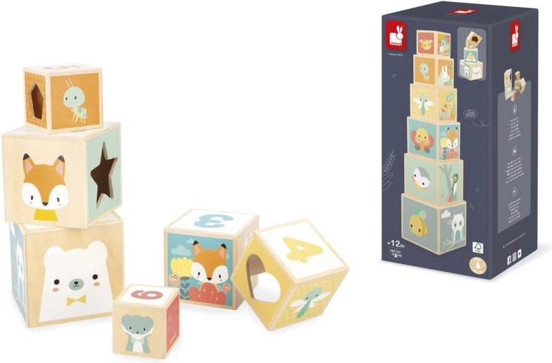 Deze houten piramide van 6 blokken betovert met zachte kleuren en liefdevolle illustraties. Kinderen kunnen de blokken stapelen, sorteren en combineren, waardoor ze de principes van balans, grootte en ruimte beter begrijpen. Elk blok heeft 5 verschillende zijden: een schattig dier, een dier in zijn omgeving, een klein dier op een gekleurde achtergrond, cijfers voor de eerste rekensommetjes en een uitgesneden vorm die bij het samenvoegen van twee blokken een vrolijke afbeelding onthult (bijvoorbeeld een katje in een hart).