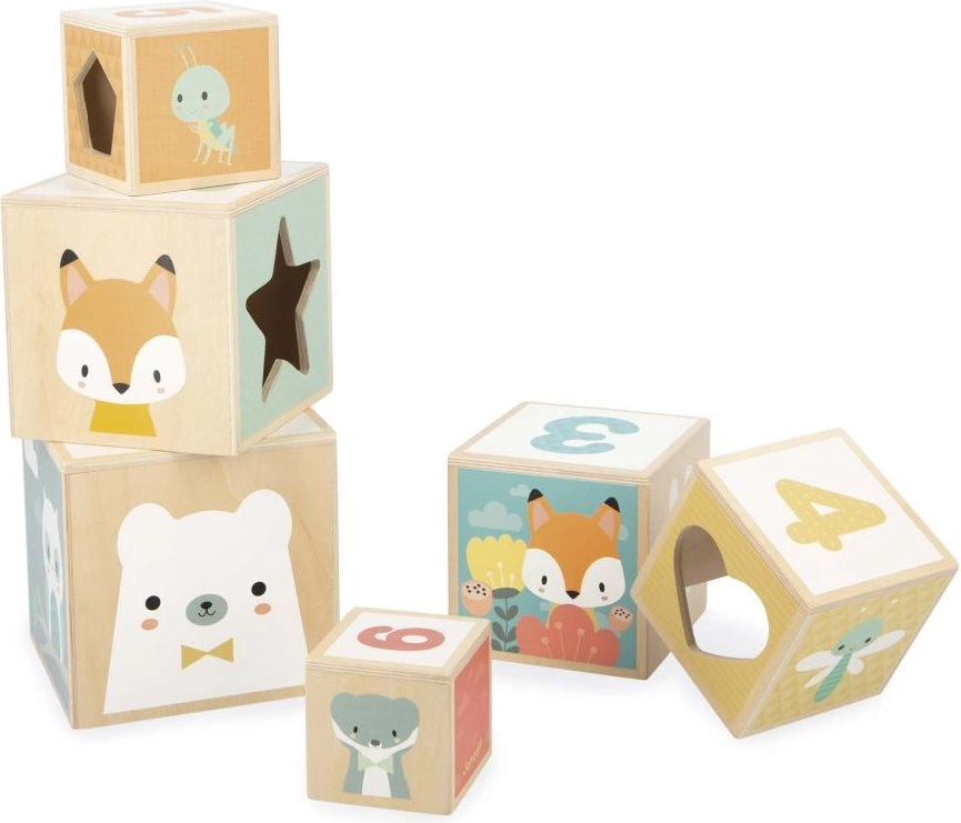 Gladde houten blokken met schattige dieren en zachte kleuren nodigen uit tot spel en zijn bestand tegen dagelijks gebruik.