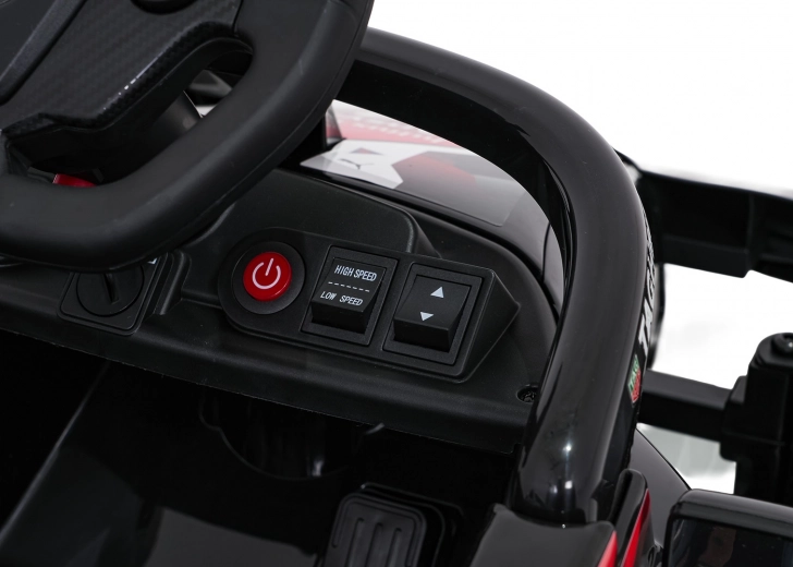 2,4 GHz afstandsbediening met 3 snelheden en nood-Stop. Audiopaneel met Bluetooth/USB/MP3, geluiden en claxon op het stuur.