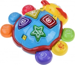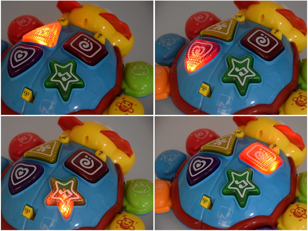 Door op de gekleurde knopjes te drukken maken kinderen kennis met kleuren en dieren; de quizknop met een vraagteken nodigt uit tot eenvoudige opdrachtjes.