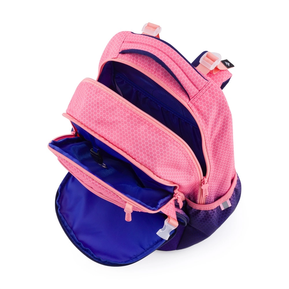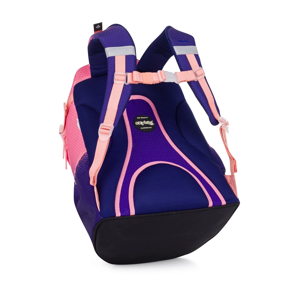 Twee grote vakken bieden plaats aan boeken, schriften en etui, terwijl het voorvak ideaal is voor een kleine snack of sleutels. De elastische zijvakken bieden comfortabel plaats aan een drinkfles. De stevige bodem voorkomt omvallen en zorgt ervoor dat de rugzak zelfstandig kan staan. Reflecterende elementen ontbreken niet voor betere zichtbaarheid in schemer en duisternis.