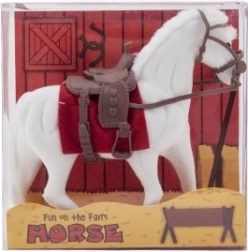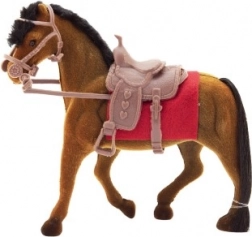 Schattige paardenfiguur van 18 cm met zadel en halster, gemaakt van kunststof met een geflockte (suèdeachtige) afwerking. Verkrijgbaar in 3 kleuren, ideaal voor boerderijspeelpret en het stimuleren van de verbeelding. Geschikt vanaf 3 jaar.