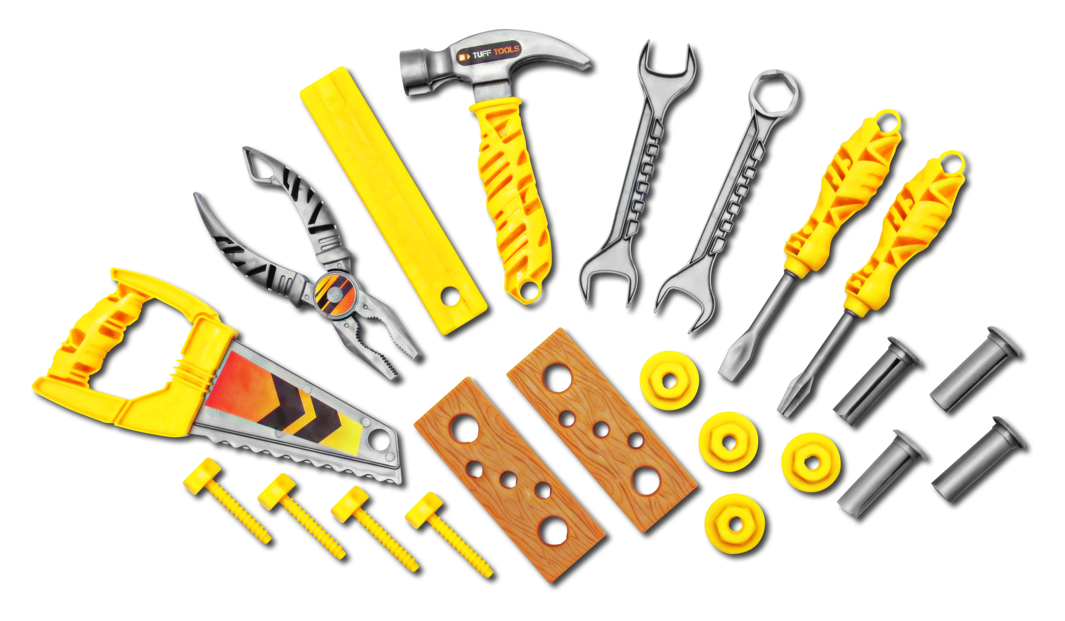 Hammertje, tang, schroevendraaiers en sleutels in kinderformaat ondersteunen de fijne motoriek en oog-handcoördinatie.