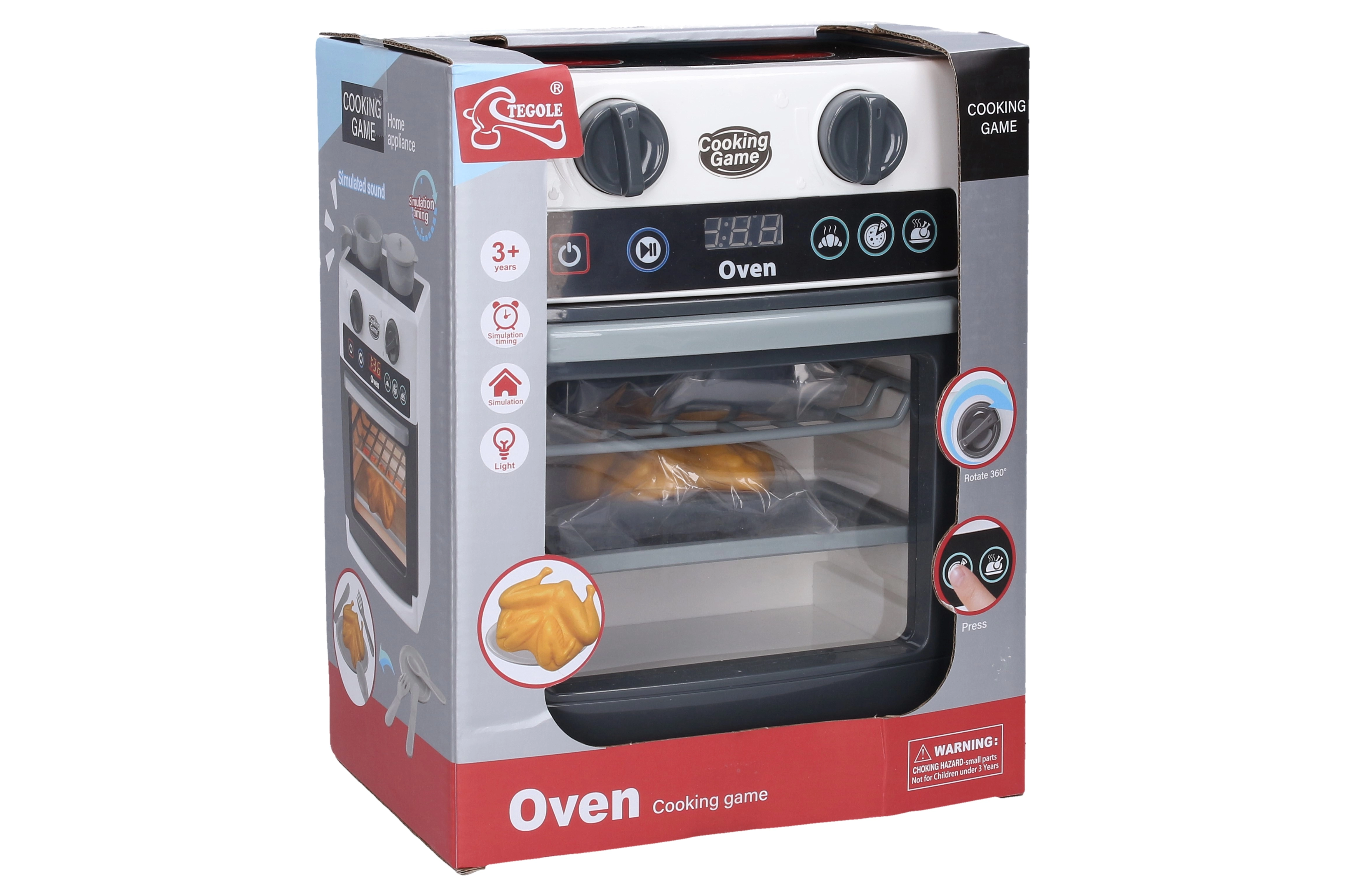 Realistische kinderoven met afmetingen 20 × 13,8 × 25,5 cm voor leuk koksspel. Biedt licht- en geluidseffecten, bediening met knoppen en bak-timer. Inclusief servies en kip voor een nog authentiekere ervaring. Voor correcte werking moeten de deurtjes gesloten zijn. Werkt op 3× AA-batterijen (niet inbegrepen).