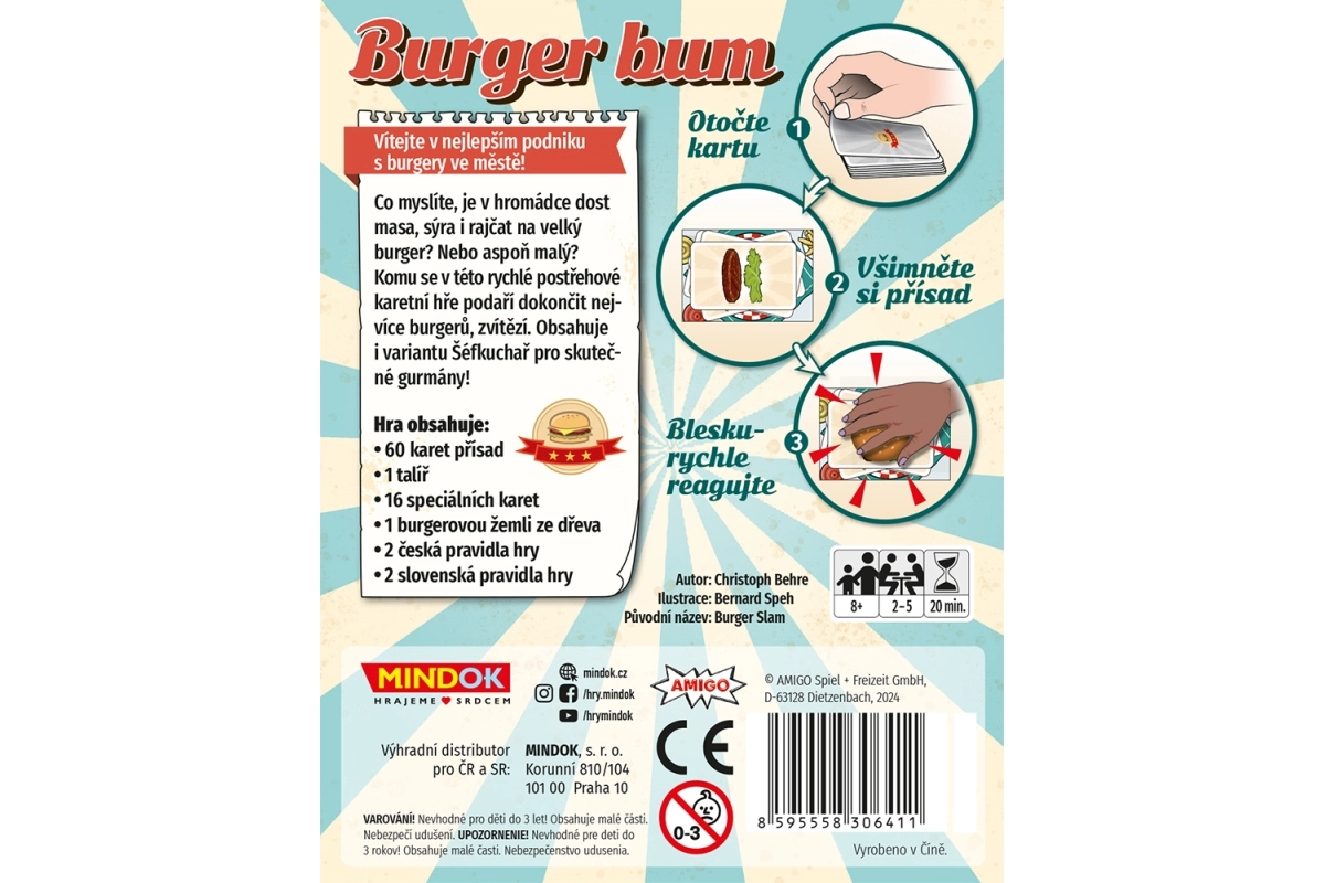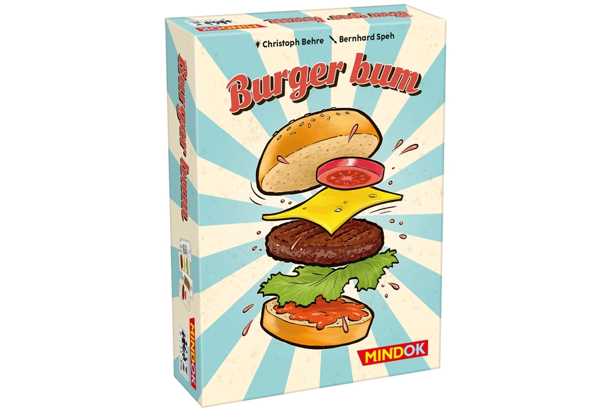 Word meester in het razendsnel stapelen van burgers in het vlotte kaartspel Burger Bum. Stapel ingrediënten op het bord, schat goed in wanneer de burger klaar is en grijp op tijd het broodje. Snel spelverloop, spannende reflexduels en plezier voor het hele gezin vanaf 8 jaar.
