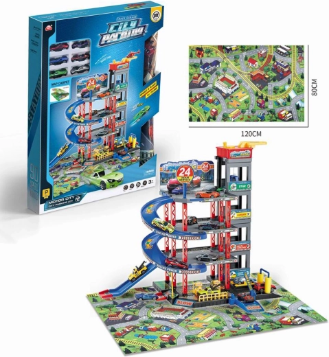 - Complete set: parkeergarage, grote mat, 6 autootjes en veel accessoires.