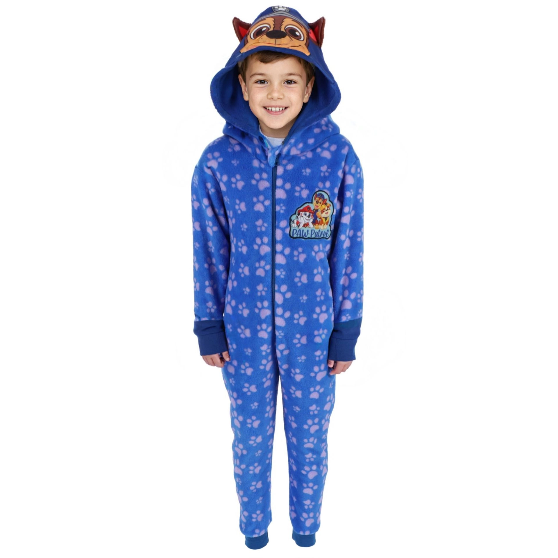 De capuchon met oortjes en een print van een PAW PATROL-figuurtje verandert de onesie in een speels kostuum.