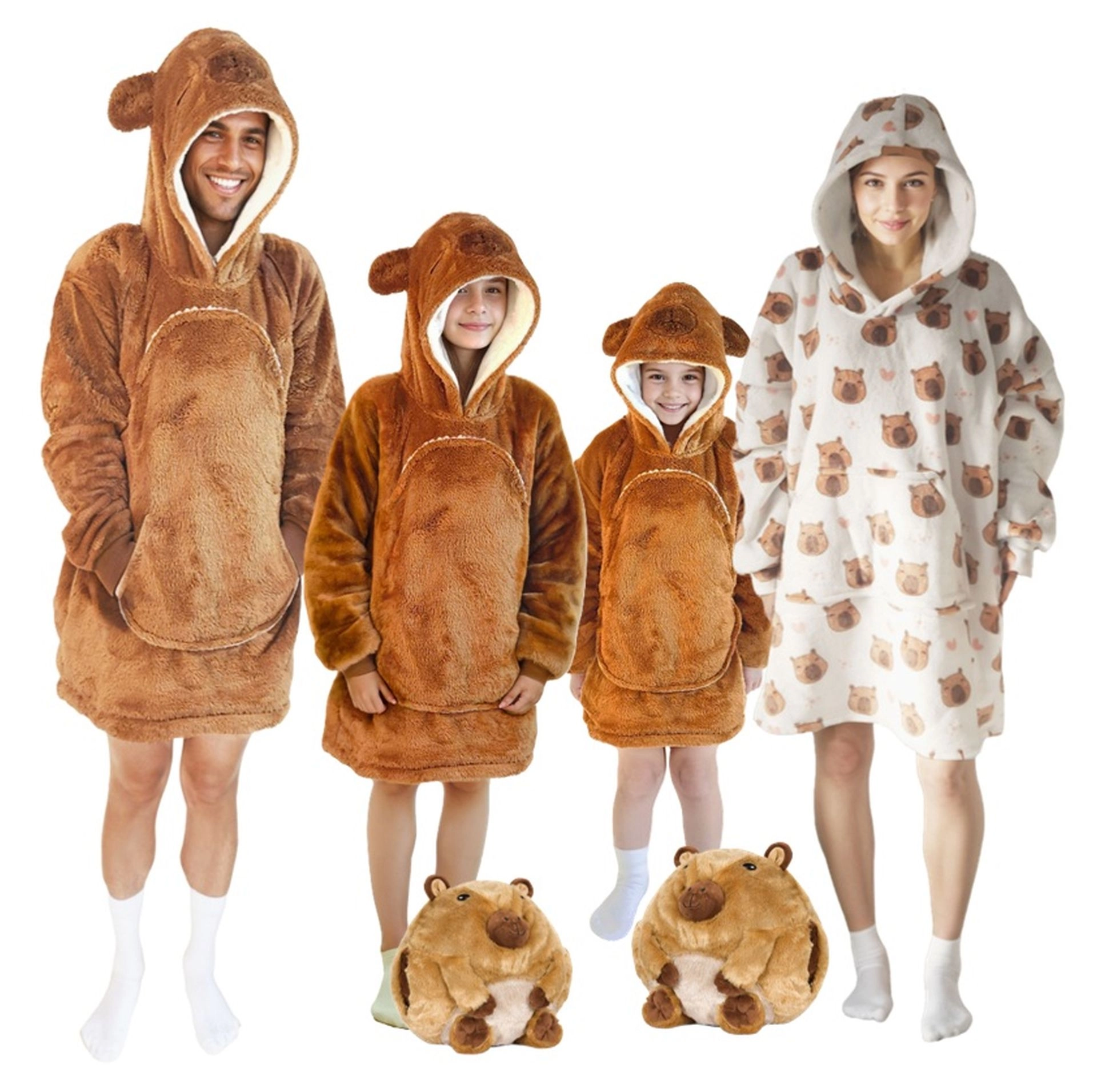 De praktische grote capuchon met dierenoortjes en de ruime buidelzak verwarmen de handen en bergen kleine spulletjes op. Dankzij de oversized pasvorm zit hij comfortabel en beperkt hij niet in beweging – ideaal voor op de bank, kamperen en koele avonden op het terras.