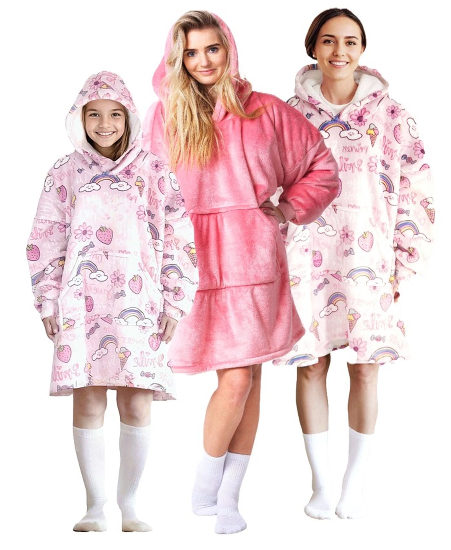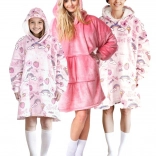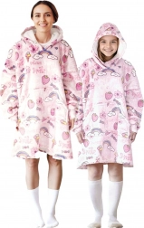 Het praktische ontwerp wordt aangevuld met een grote capuchon en een ruime buidelzak voor handen of kleine spulletjes. De speelse roze print met snoepjesmotief zal elk kind blij maken en maakt van de hoodie-deken een geweldig cadeau-idee.