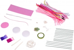 Wat je in de set vindt: kleurrijke creatieve draadjes, decoratieve elementen (pareltjes, linten), kleurpoeder, vilt, sponsje, tape, lijmstift (accessoire – gebruik niet noodzakelijk) en een instructie met afbeeldingen.