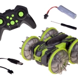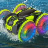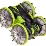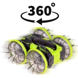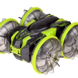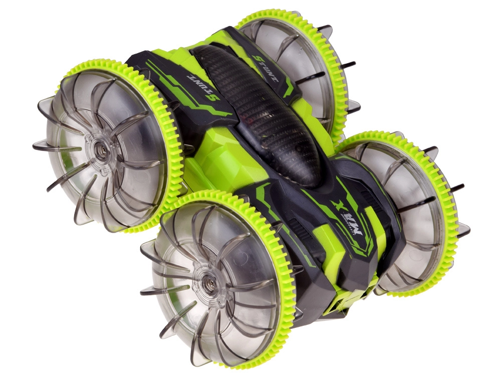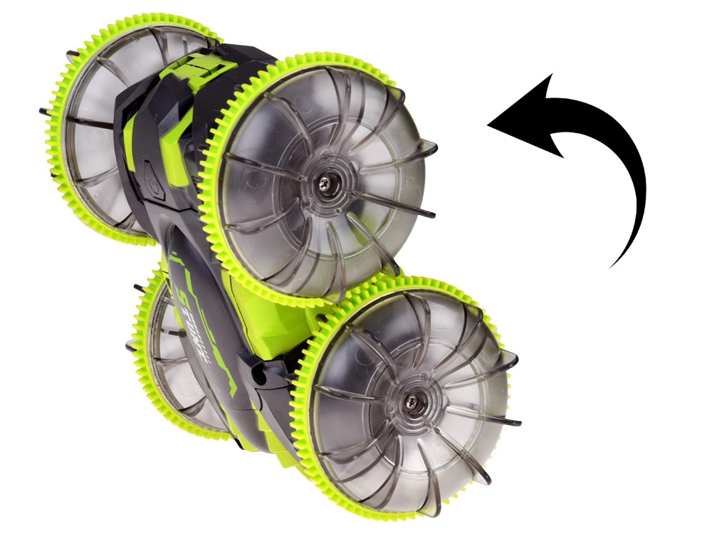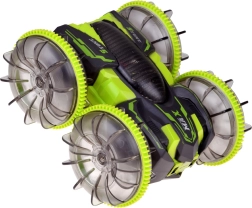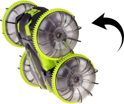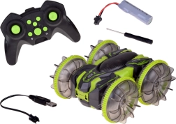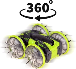 Beleef adrenaline met de amfibische stunt RC-auto die moeiteloos gras, tapijt, tegels en het wateroppervlak aankan. Grote transparante wielen met een uitgesproken profiel en LED-onderverlichting zorgen voor uitstekende grip en een spectaculair uiterlijk, ook in het donker. Dankzij de 360°-spin rijdt hij door, zelfs na omkeren.