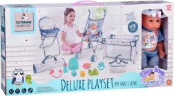 Maak kinderen blij met een realistische babypverzorgingsset die alles bevat voor dagelijkse rituelen – van voeden en wandelen tot naar bed brengen. De pop heeft bewegende ledematen, zachte kleertjes en zit in zowel de kinderstoel als de kinderwagen. Kinderwagen en bedje hebben een licht, opvouwbaar frame, waardoor ze makkelijk te dragen en snel op te ruimen zijn.