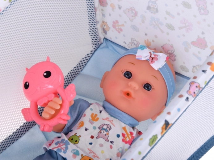 De praktische uitrusting omvat een eetset (kom, bestek en flesje), een potje, fopspeen met ketting, kleurrijke blokjes en een rammelaar. Het reisbedje met ademende gaaszijden en tas is ideaal om mee te spelen en op te bergen. Dankzij de uitgebreide accessoires bootsen kinderen eenvoudig echte babyverzorging na en ontwikkelen ze communicatie en fijne motoriek.