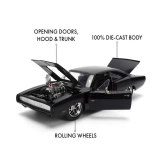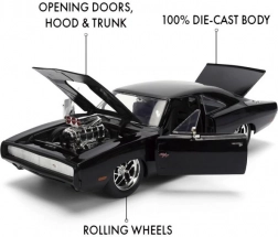 Iconisch verzamelmodel van de 1970 DODGE CHARGER uit de film Fast & Furious op schaal 1:24 dat zowel fans van muscle cars als van de filmreeks zal bekoren. Biedt metalen constructie, openende deuren, motorkap en kofferbak en realistische details waaronder de opvallende compressor op de motorkap. De lengte van het model is circa 21 cm.
