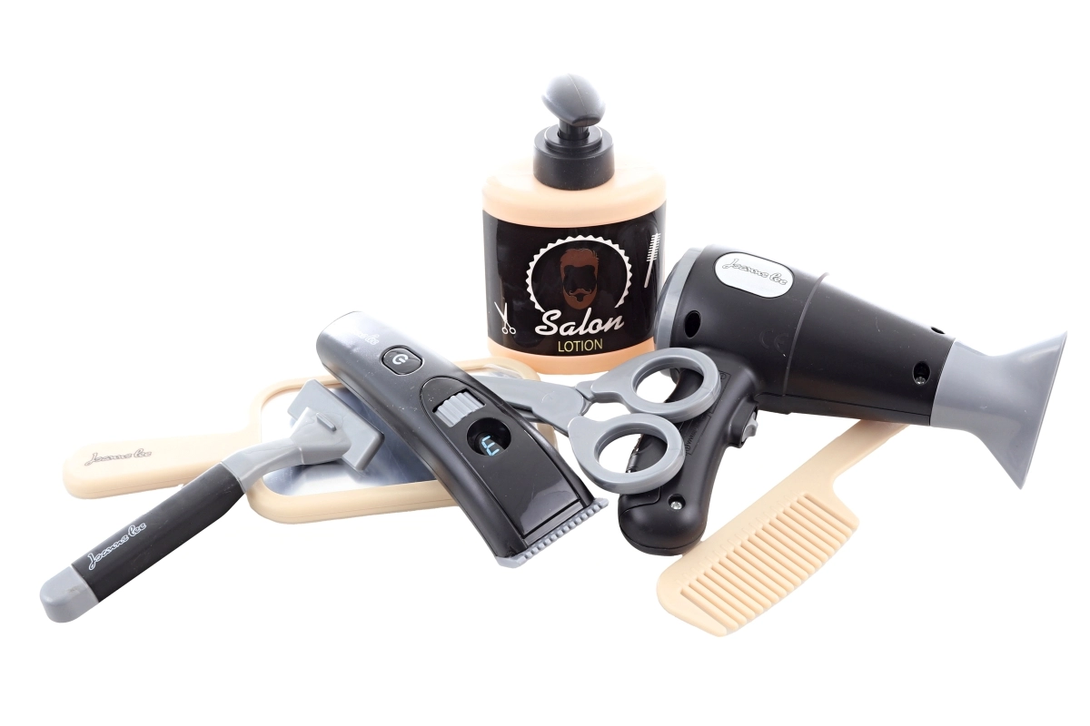 Een leuke kappersset voor kleine stylisten met alles wat je nodig hebt voor creatief spel. Inclusief stoffen riem, accessoires en een functionele föhn op batterijen die bij inschakelen licht geeft en geluiden maakt. Ideaal voor het stimuleren van de verbeelding en rollenspel voor kinderen vanaf 3 jaar.