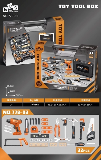 - koffer, boor–schroevendraaier, mes, schroevendraaier, handzaag, meetlint, 2× imitatie houten plaatjes, hamer, tang, 2× kleinere en 2× grotere schroefelementen, metaalzaag, 5× opzetstuk, ring-steeksleutel, schuifmaat, grote plaat, 4× schroef, 3× verwisselbare bit, bit voor boor, waterpas, verstelbare moersleutel