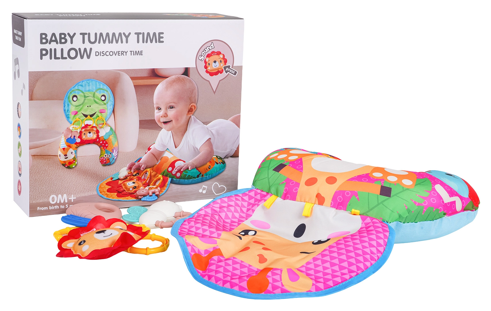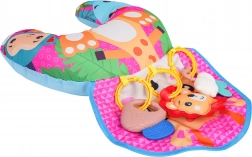 Er zijn drie afneembare hangspeeltjes inbegrepen – een leeuwtje met piepertje, een bijtje met bijtring en een paddenstoel met rammelaar. Vrolijke kleuren en verschillende texturen prikkelen zicht, gehoor en tast en motiveren het kind om te grijpen en te ontdekken.