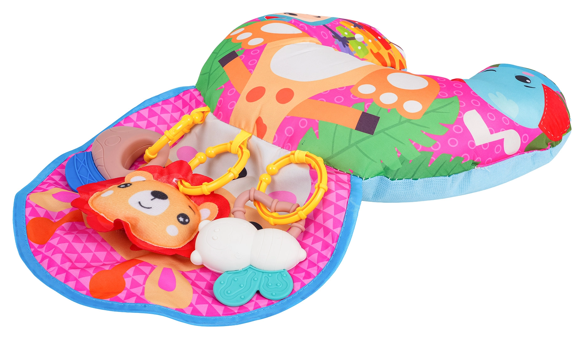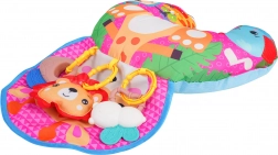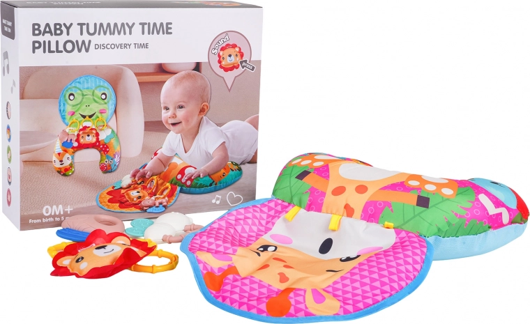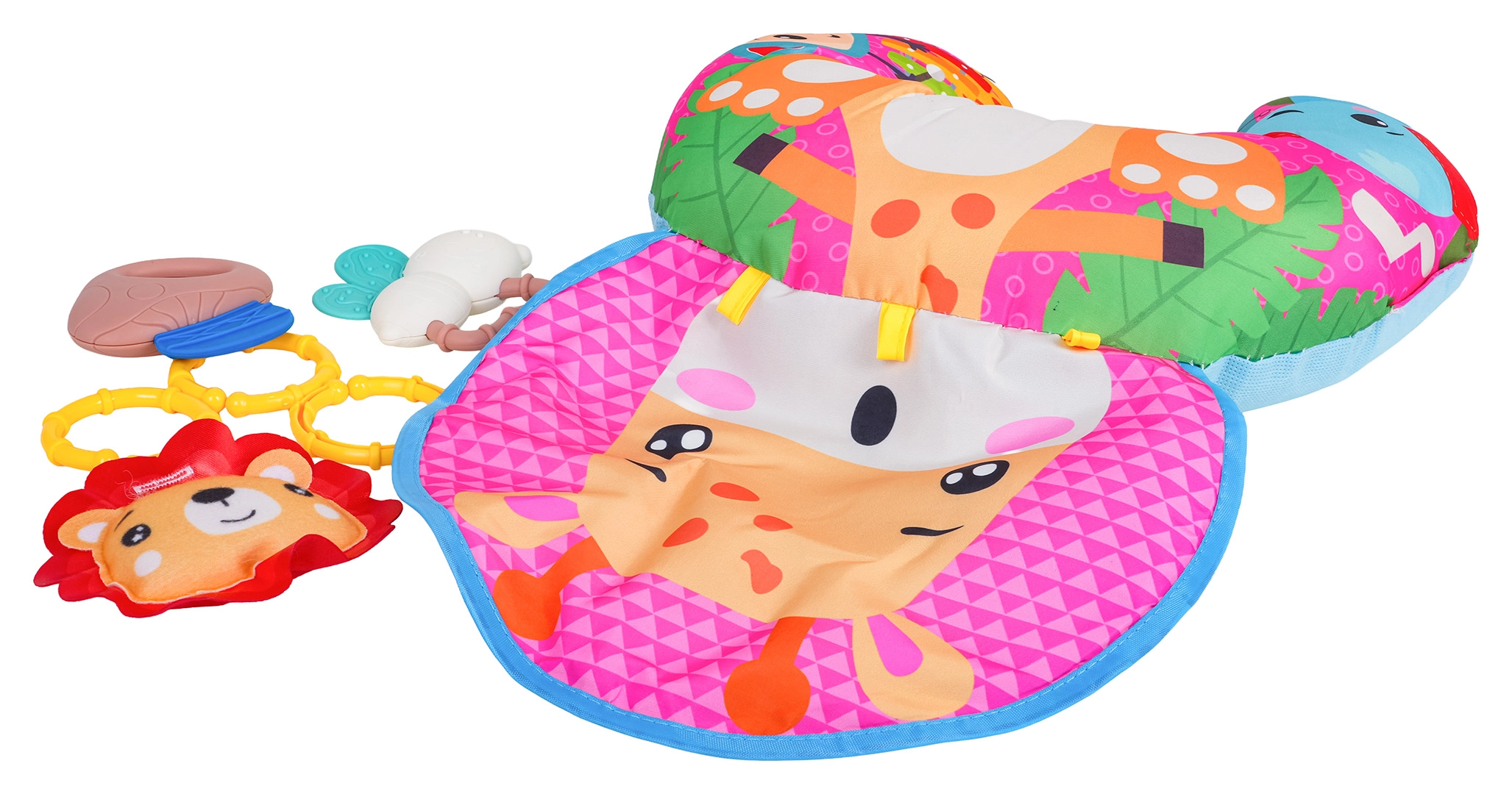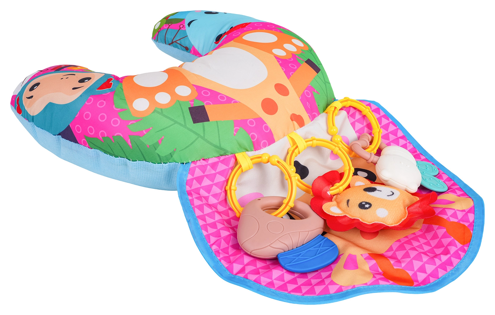 Zacht en kleurrijk U‑vormig babykussen met girafmotief ondersteunt je kleintje bij tummy time en tijdens het zitten. Inclusief afneembare hangende speeltjes met bijtringen, ramelaar en piepertje, die zintuigen en motoriek ontwikkelen. Geschikt vanaf de eerste levensdagen, gemaakt van veilige materialen.