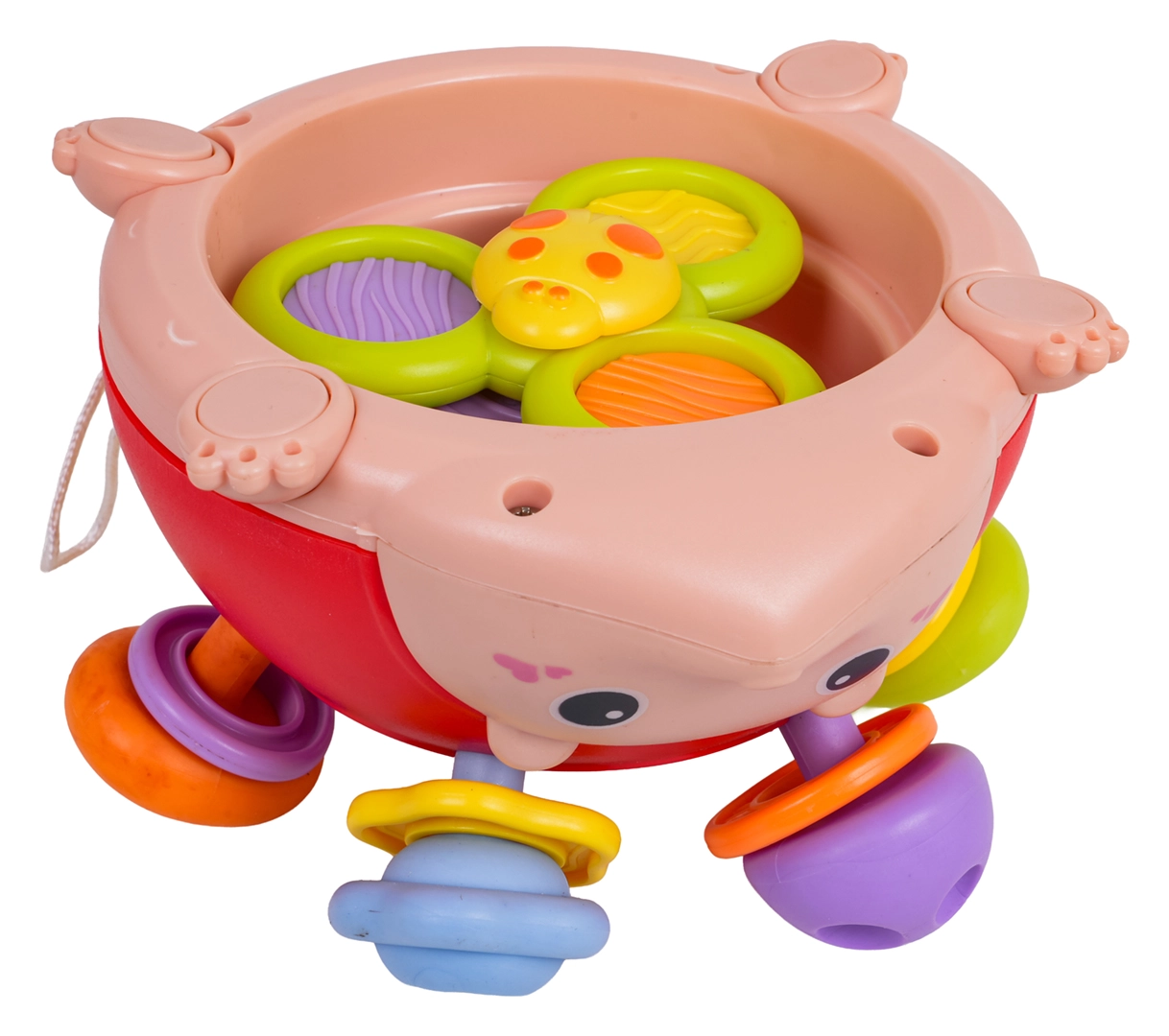 Onder de uitsteeksels zitten gekleurde ringen die rammelen wanneer je schudt. Kinderen kunnen ze afhalen, weer terugplaatsen en de oog-handcoördinatie trainen.