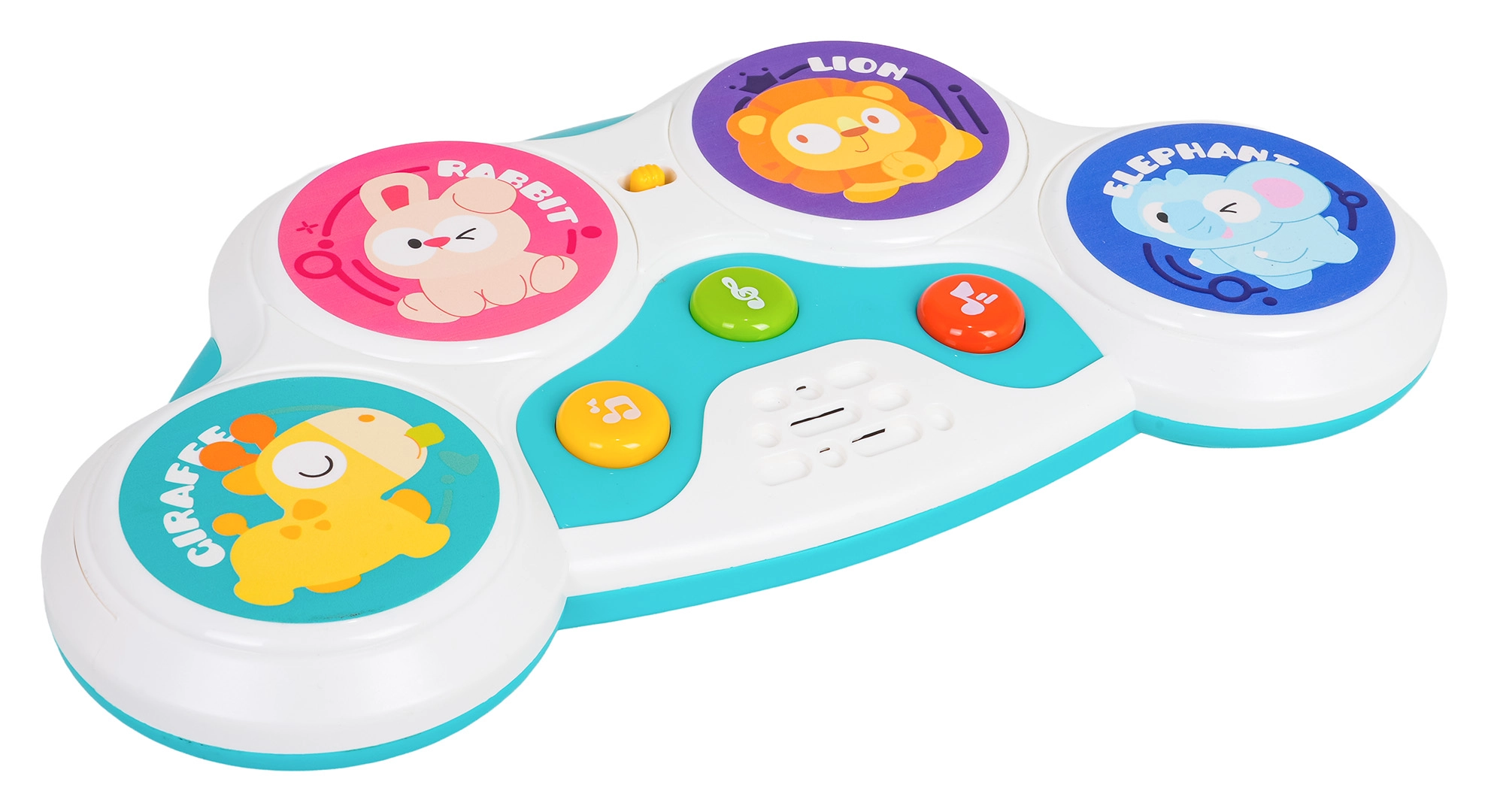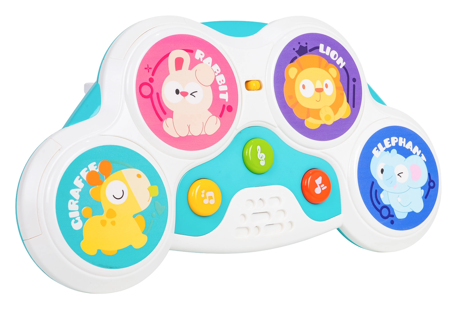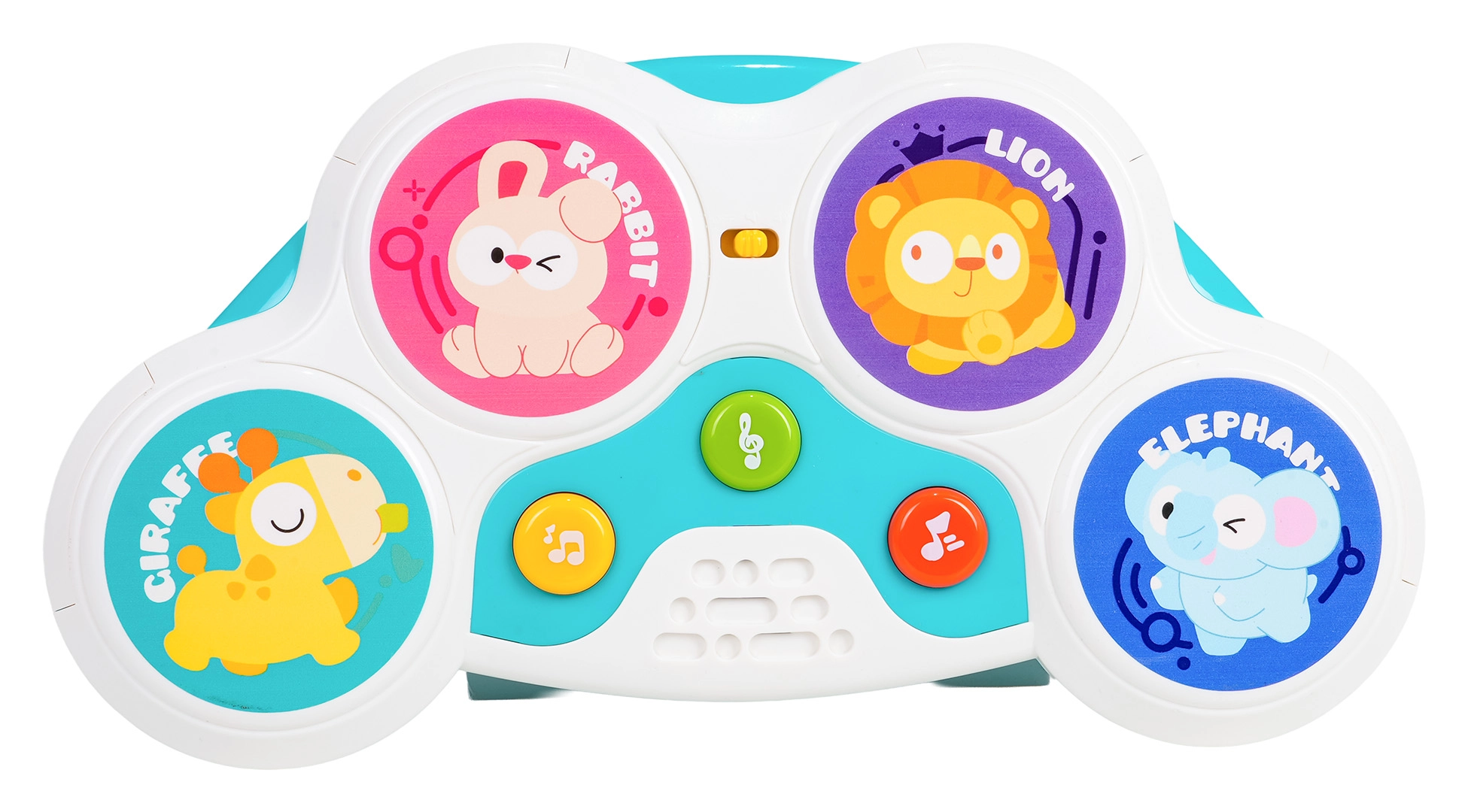Interactief aanraak-percussiepaneel voor kinderen vanaf 18 maanden, goed voor spelenderwijs leren en zintuiglijke ontwikkeling. Bij het aanraken van de kleurrijke vlakken met dieren klinken melodieën, dierengeluiden en drumritmes, begeleid door knipperende lichtjes. Het gladde ontwerp zonder scherpe randen en de volumeregeling zorgen voor veilig en prettig spel.