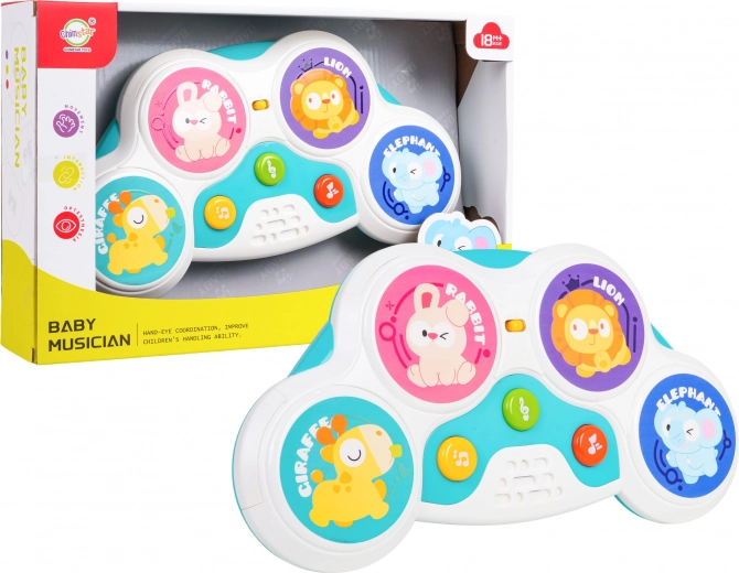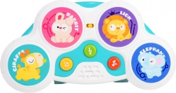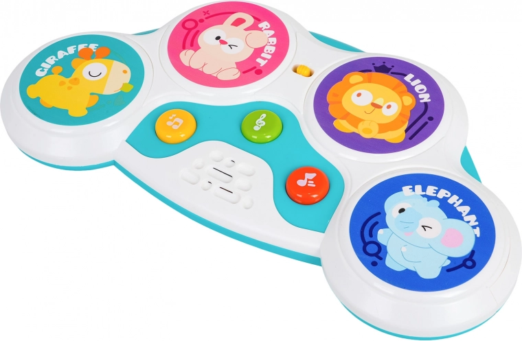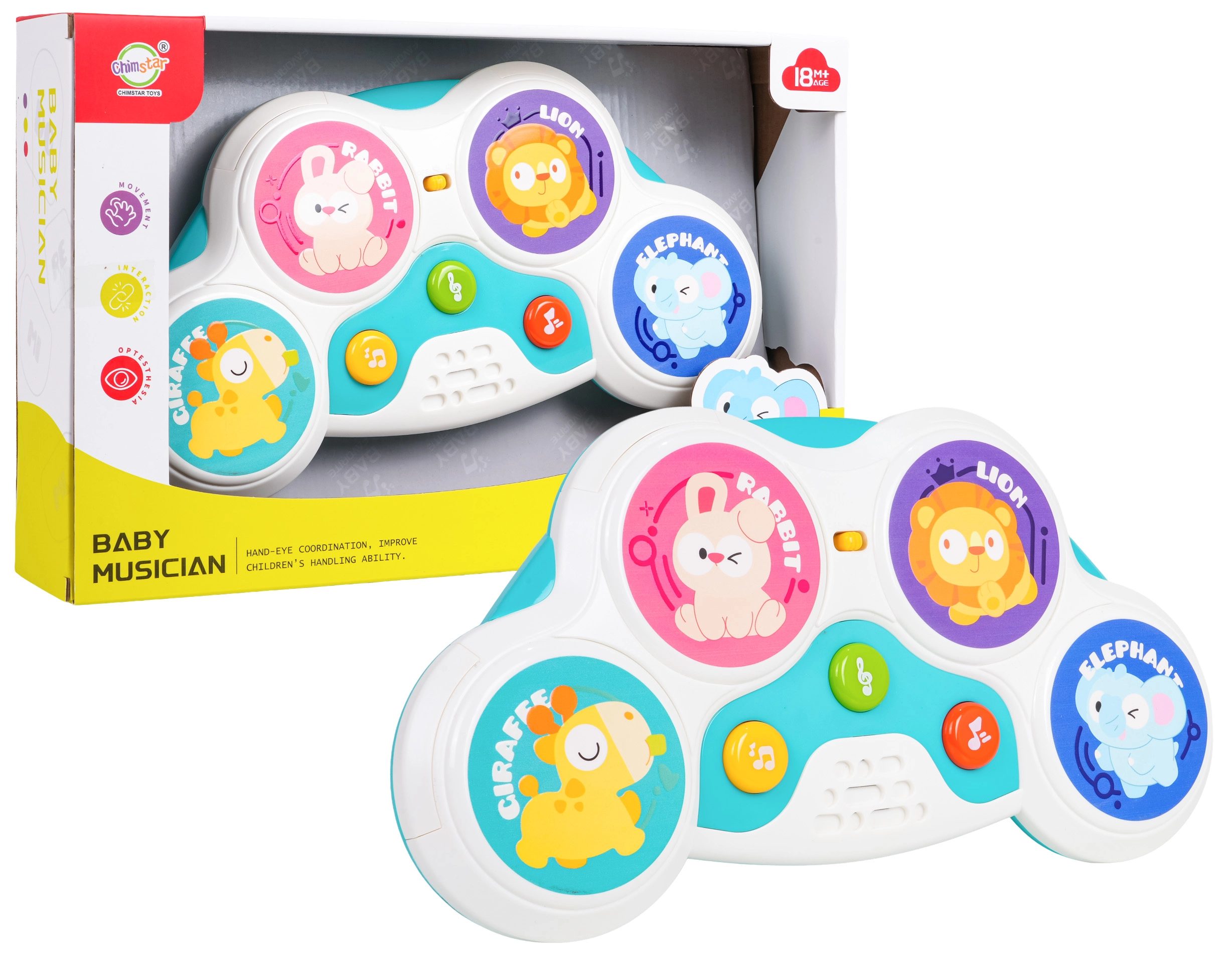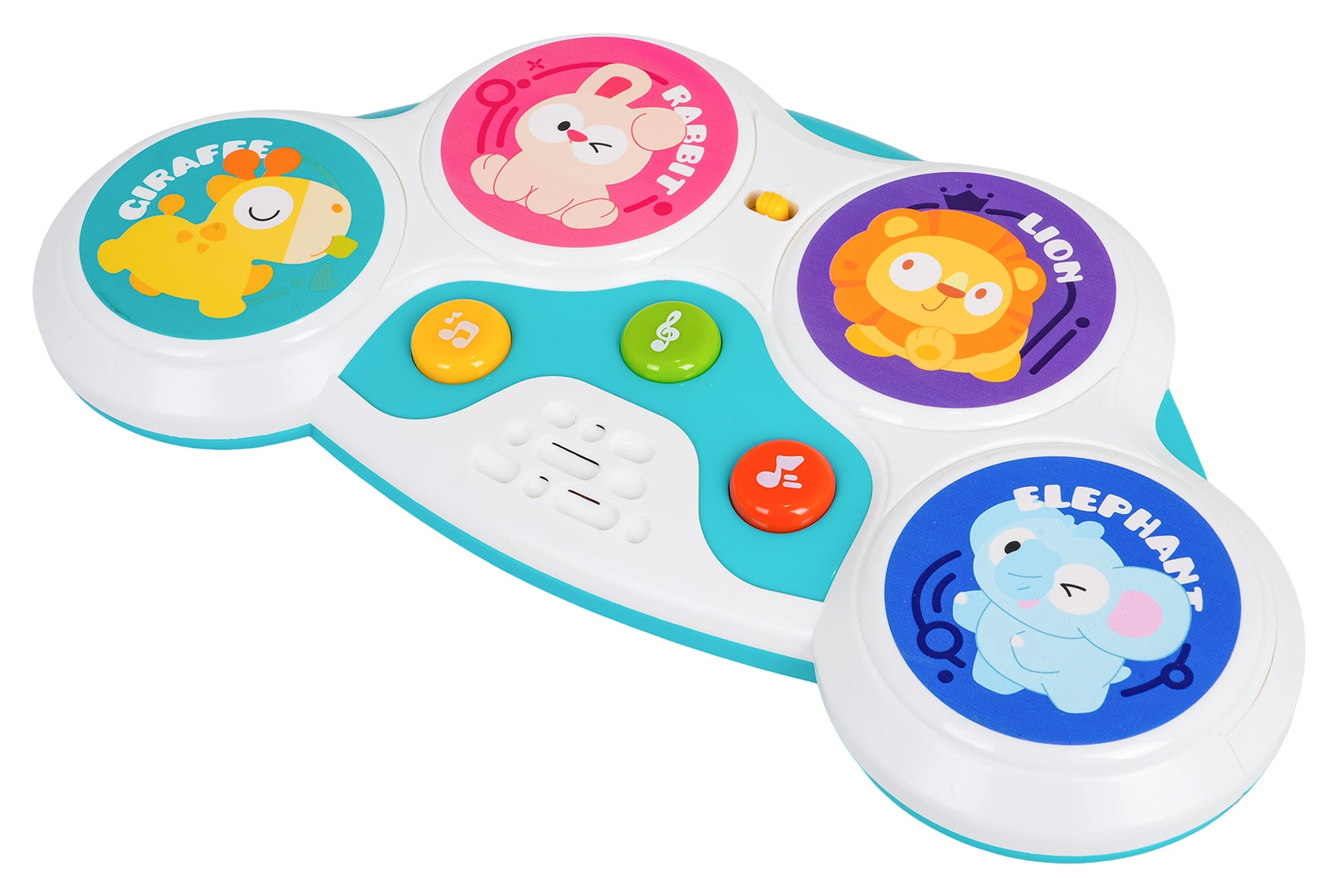 Interactief aanraak-percussiepaneel voor kinderen vanaf 18 maanden, goed voor spelenderwijs leren en zintuiglijke ontwikkeling. Bij het aanraken van de kleurrijke vlakken met dieren klinken melodieën, dierengeluiden en drumritmes, begeleid door knipperende lichtjes. Het gladde ontwerp zonder scherpe randen en de volumeregeling zorgen voor veilig en prettig spel.