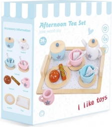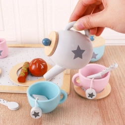 Bevat alles wat nodig is voor stijlvolle verwennerij: pot met deksel, suikerpot, melkkannetje, 2 kopjes met schoteltjes en lepeltjes, een dienblad en kleine “lekkernijen”. Spel ontwikkelt op natuurlijke wijze de fijne motoriek, coördinatie en samenwerking, en leert kinderen tegelijkertijd delen en tafeletiquette.
