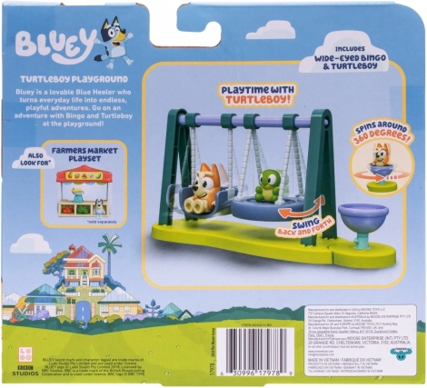 Deze kleurrijke mini speelset met schommels zal alle kleine fans van BLUEY blij maken. Twee functionerende schommels en een draaiende schaal/draaimolen nodigen uit tot eindeloze speeltuinverhalen. Kinderen kunnen Bingo en het schildpadje plaatsen, ze heen en weer laten schommelen en ze daarna ronddraaien tot ze giechelen van plezier.