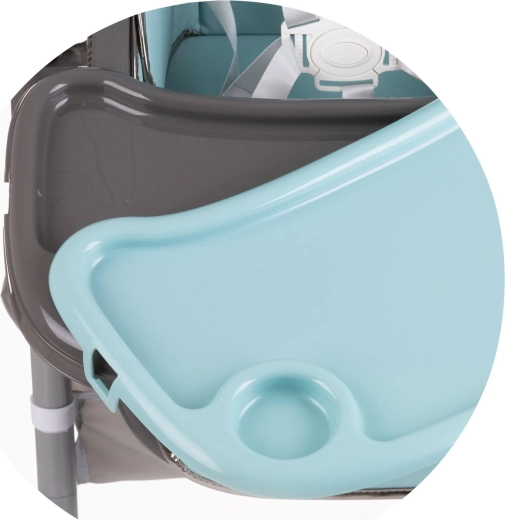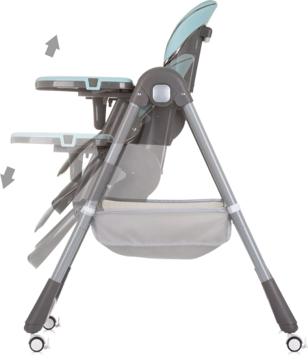 Het dubbele blad met een bovenste afneembaar deel maakt onderhoud gemakkelijk en de verstelling in 4 posities past zich aan elke situatie aan. De speelboog met speelgoed vermaakt de baby, zodat jij in alle rust kunt dekken. Vier wieltjes maken verplaatsen in huis gemakkelijk en de opbergmand houdt alle benodigde spulletjes binnen handbereik. Na het eten klap je de stoel snel en compact in om ruimte te besparen.