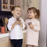 De praktische set bevat 2 bekers, 2 lepeltjes en 2 koffiecapsules, zodat kinderen ook vriendjes of broertjes en zusjes kunnen bedienen. De compacte afmetingen van 16,5 × 21 × 21,5 cm garanderen dat de machine op elk kinderkeukentje past.