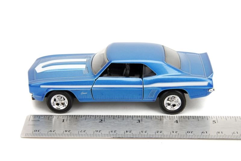 Deze stijlvolle dubbele set brengt twee klassieke musclecars in verzamelkwaliteit: een blauwe Chevrolet Camaro 1969 met witte strepen en een matzwarte Dodge Charger Wide Body 1968. Realistische proporties, strakke carrosserielijnen en transparante ramen versterken de filmsfeer van de Fast & Furious-serie.