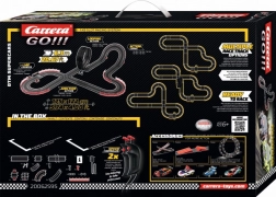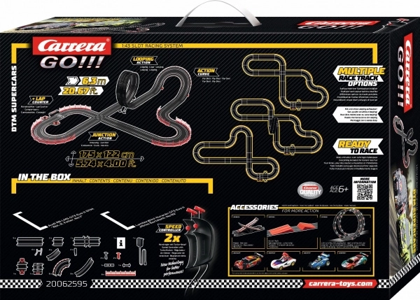 Beleef spannende races met de CARRERA GO DTM Supercars racebaan van 6,3 m met de geweldige modellen Audi R8 LMS GT3 en Lamborghini Huracán GT3. De set biedt overhellende bochten, een looping, een kruising en een mechanische rondenteller voor een echte race-ervaring. Dankzij de turbo-controllers, dubbele contactborstels en magneten blijven de auto’s uitstekend op de baan en leveren ze een snelle en vloeiende rit.