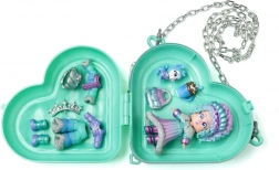 De harde case in hartvorm houdt de pop en accessoires netjes bij elkaar en dankzij de kettingriem neem je hem overal mee naartoe.