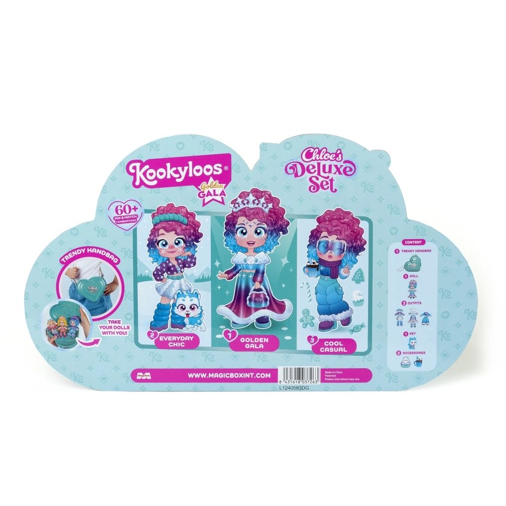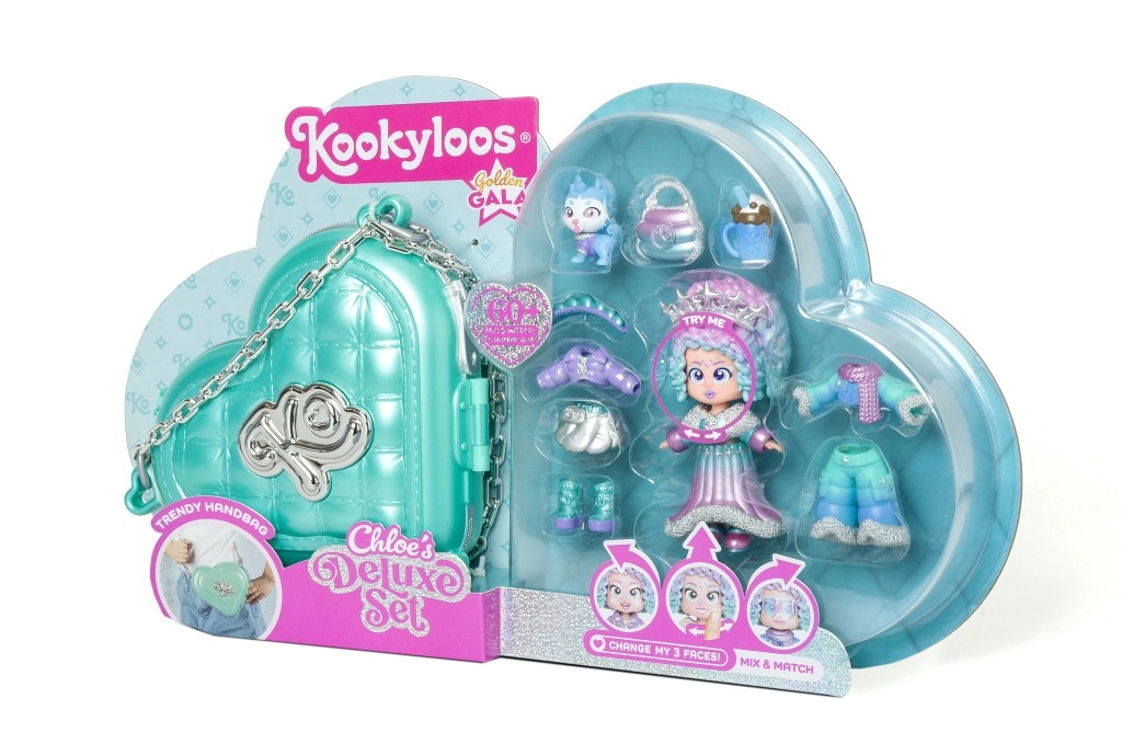 Ontdek stijl en plezier met de KookyLoos Chloe-pop in de luxe Golden Gala Deluxe-set. Je krijgt 3 mix-&-match outfits, verwisselbare gelaatsuitdrukkingen met één klik, een schattig huisdiertje en een elegante hartvormige handtas voor onderweg. Perfect om creatief te stylen, te spelen en te verzamelen.