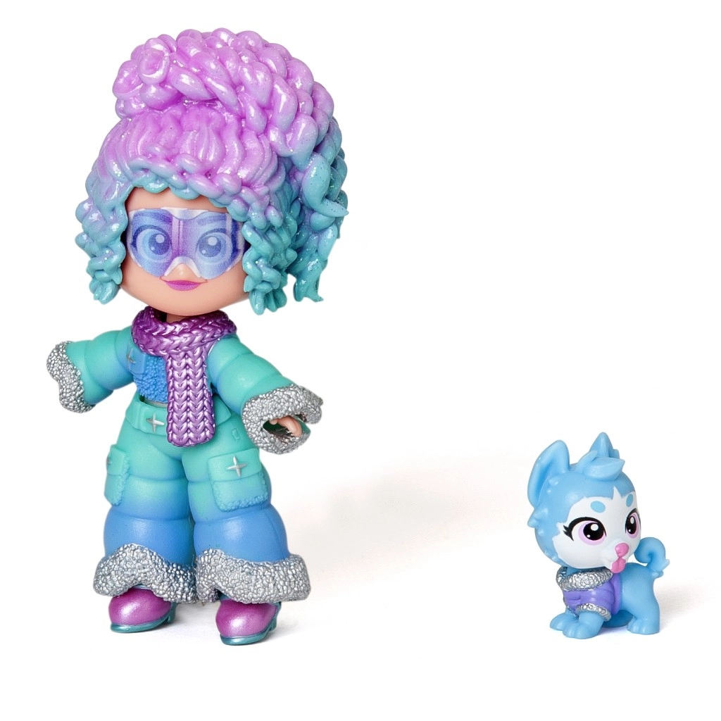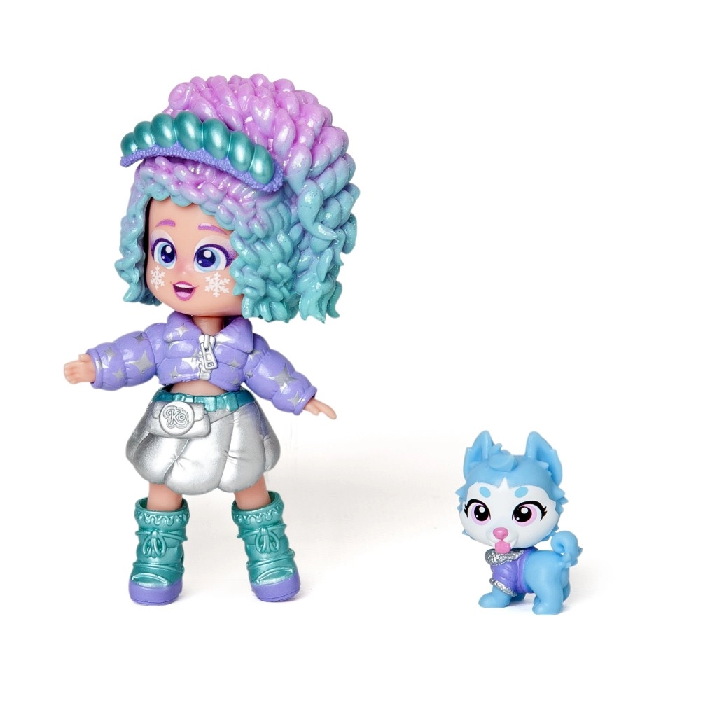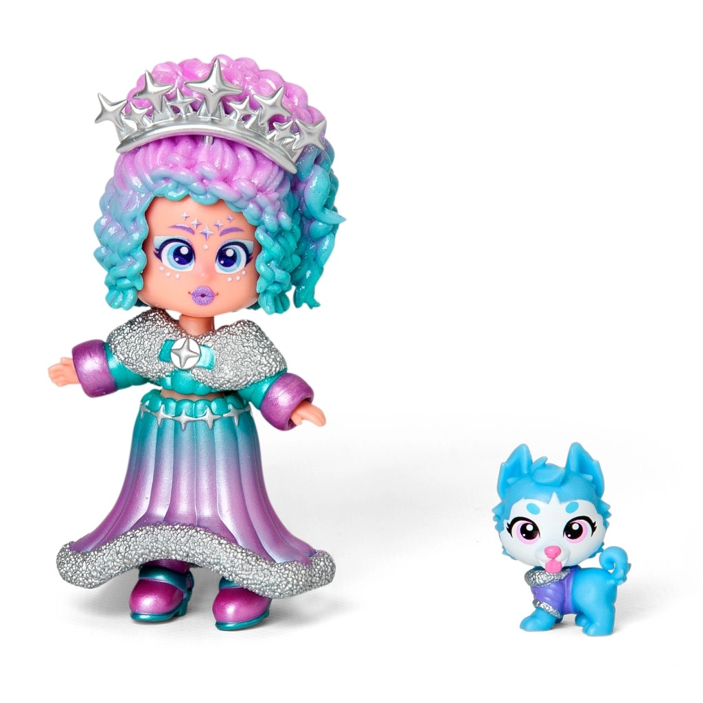 Een stijlvolle pop met opvallend haar en glinsterende accenten, aangevuld met een schattig hondje voor nóg meer speelse verhalen.
