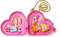 De stijlvolle harttas met ketting dient als draagbare opberdoos voor de pop en accessoires – ideaal om overal te spelen.