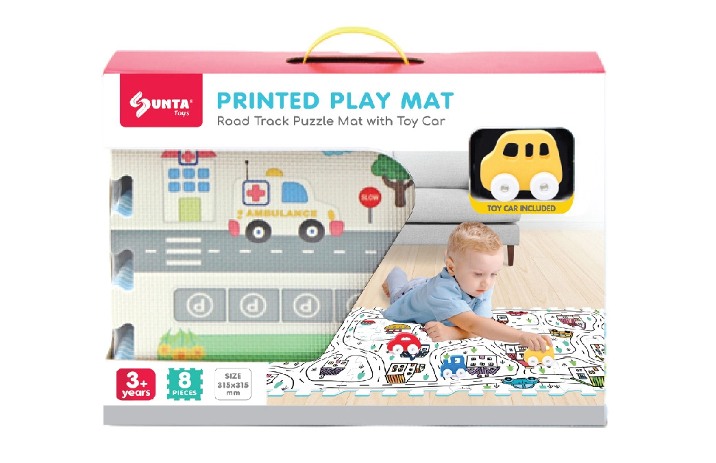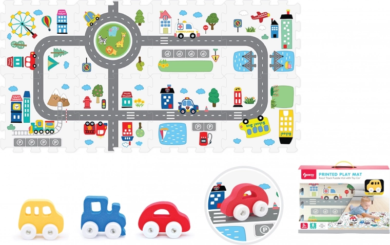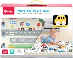 Ontdek een creatieve set voor kleine bouwers: zachte foamblokken met stadsprint en een autootje met vrij draaiende wielen. De set bevat 8 grote delen van 31,5 × 31,5 × 1 cm, die veilig, licht en gemakkelijk afwasbaar zijn – ideaal voor thuis en in kleuterscholen.