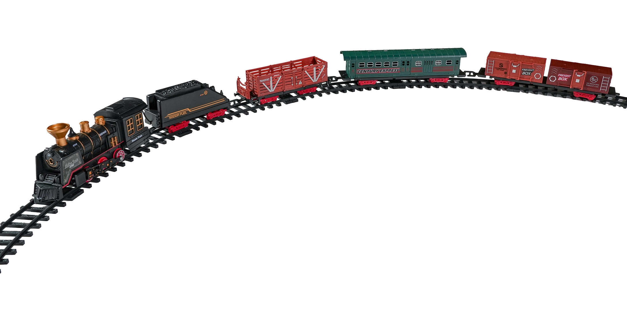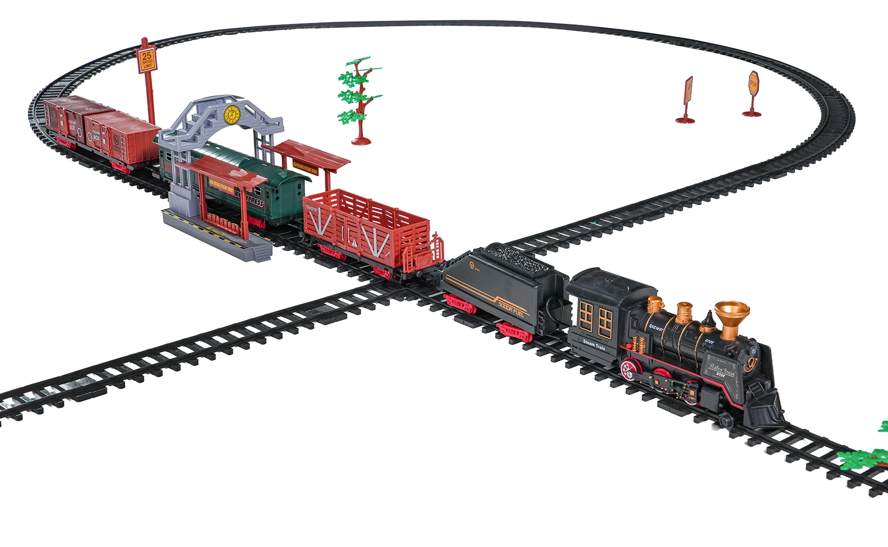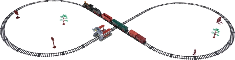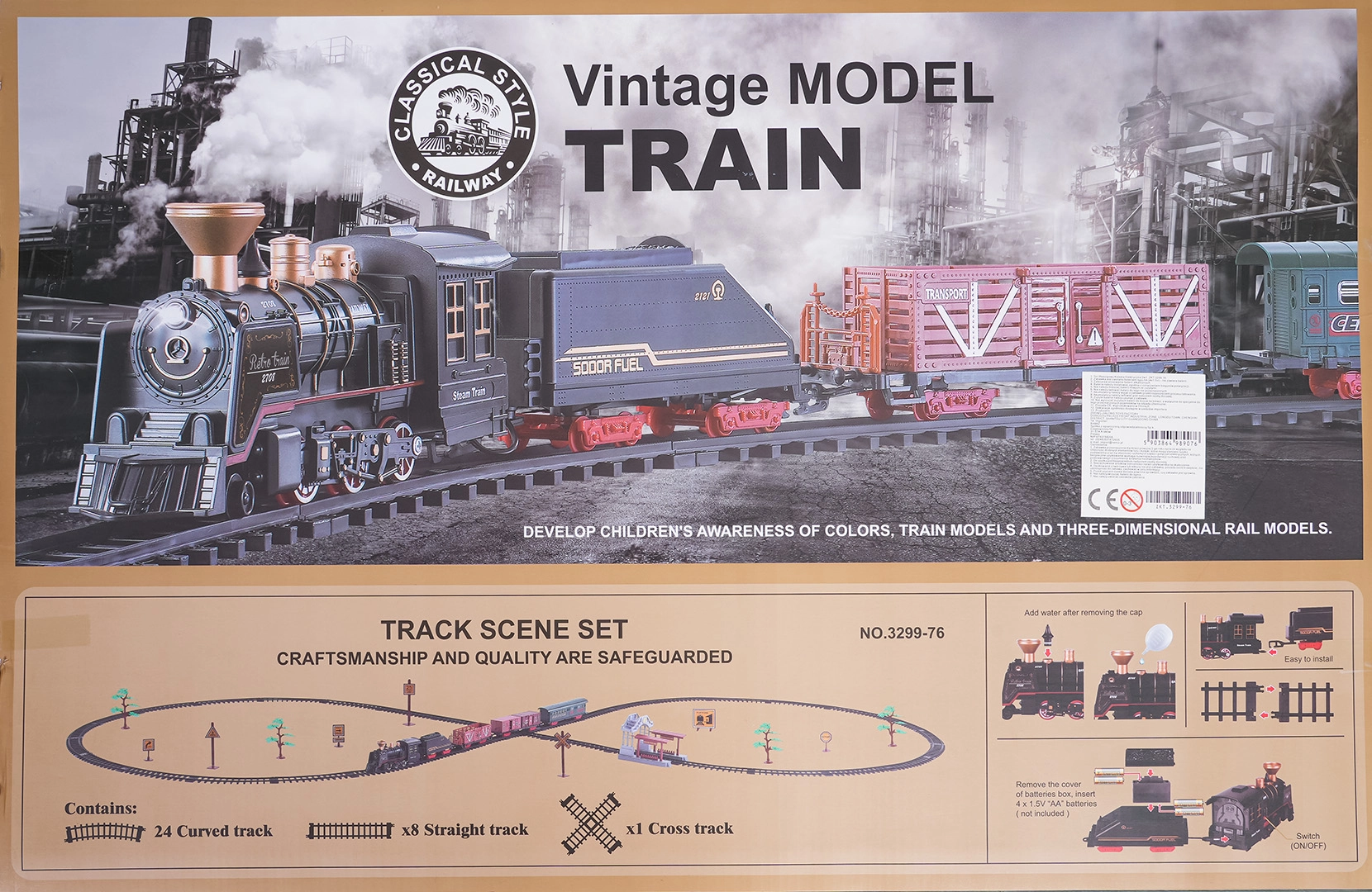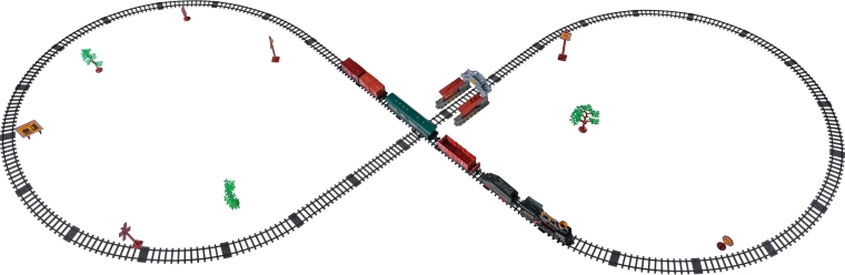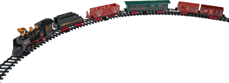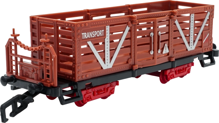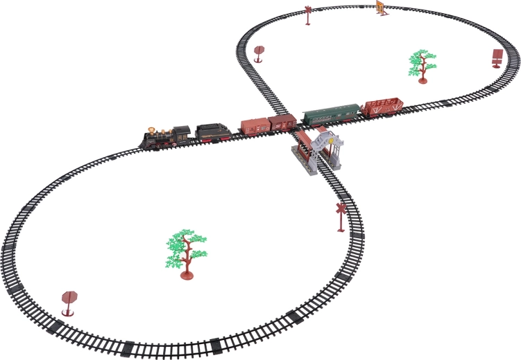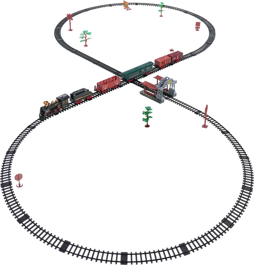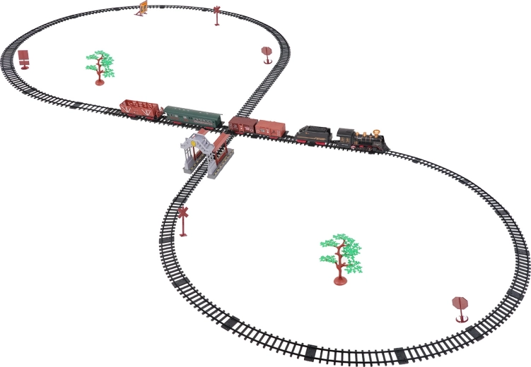 De set bevat een complete treincombinatie met locomotief, tender, personen- en goederenwagons, een set rails en thematische accessoires zoals boompjes en borden. De set stimuleert fantasie, fijne motoriek en geduld en is ideaal als cadeau voor kleine treinliefhebbers.
