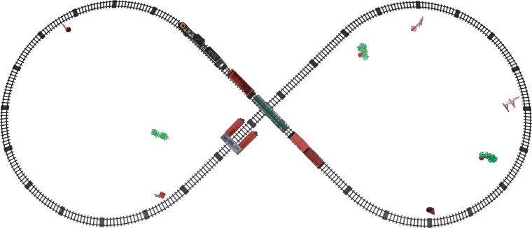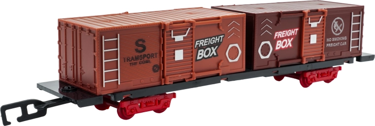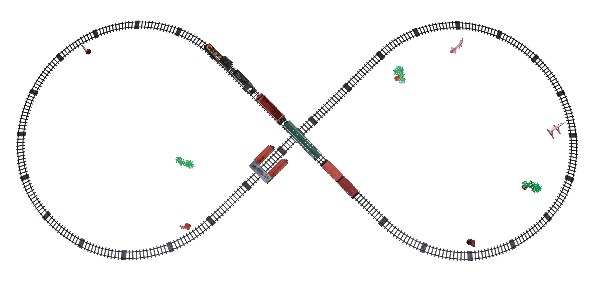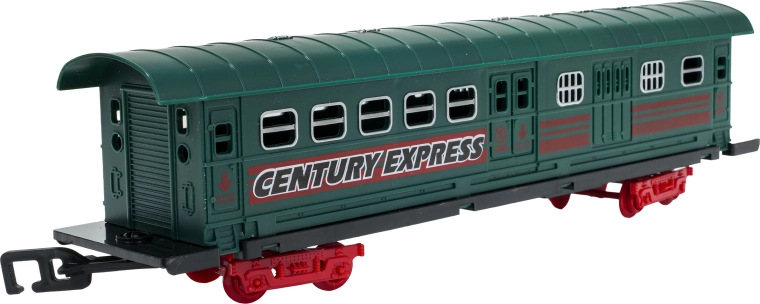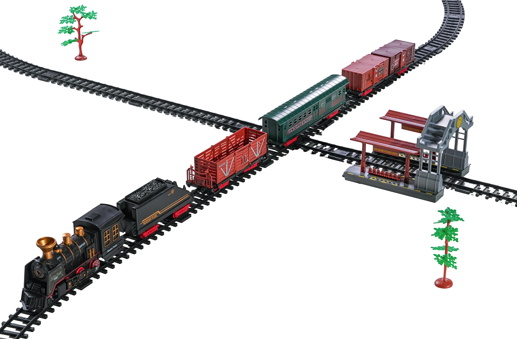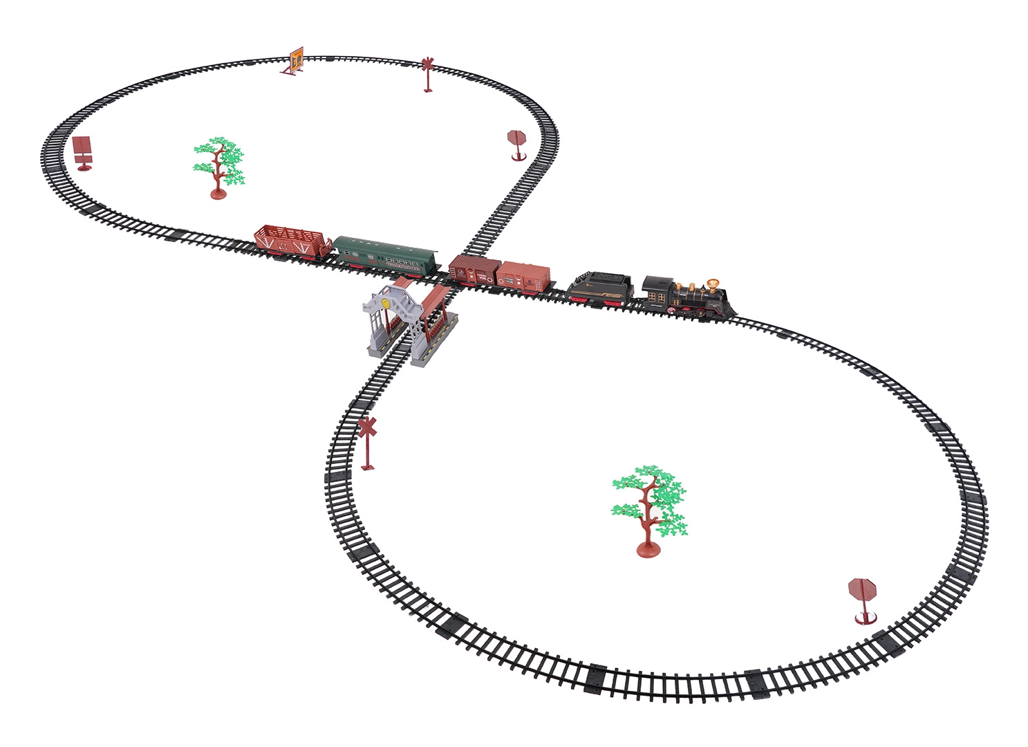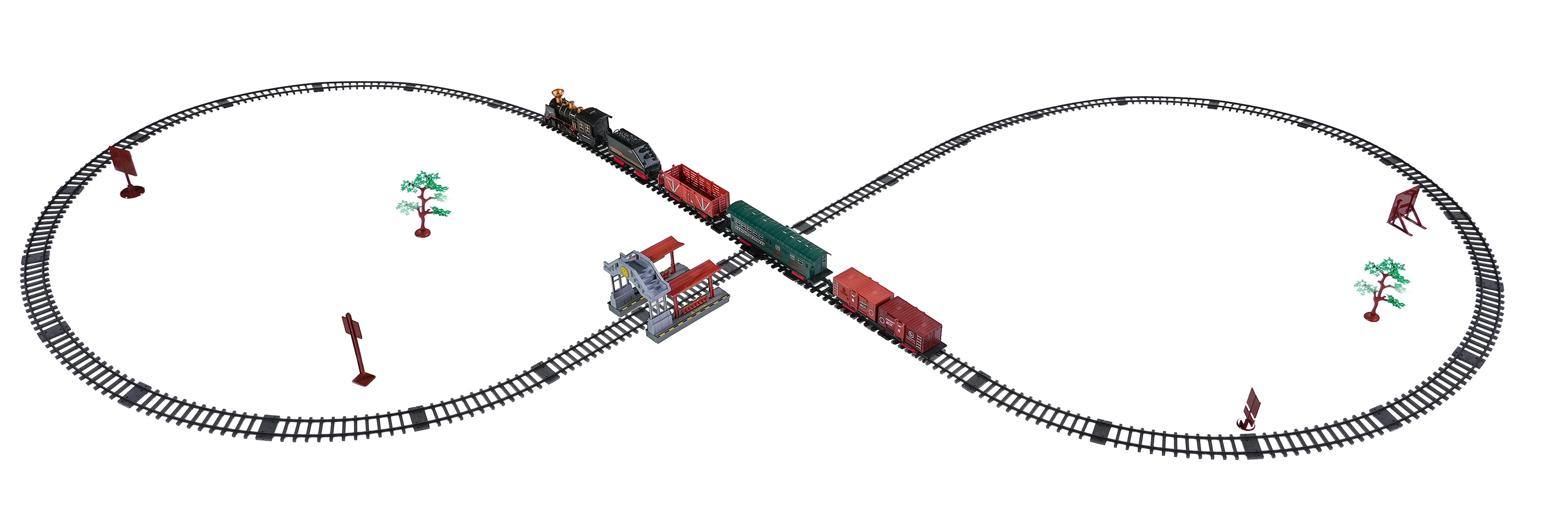 In de doos vind je een locomotief met tender, personen- en goederenwagons, borden en boompjes – alles voor creatief spelen.