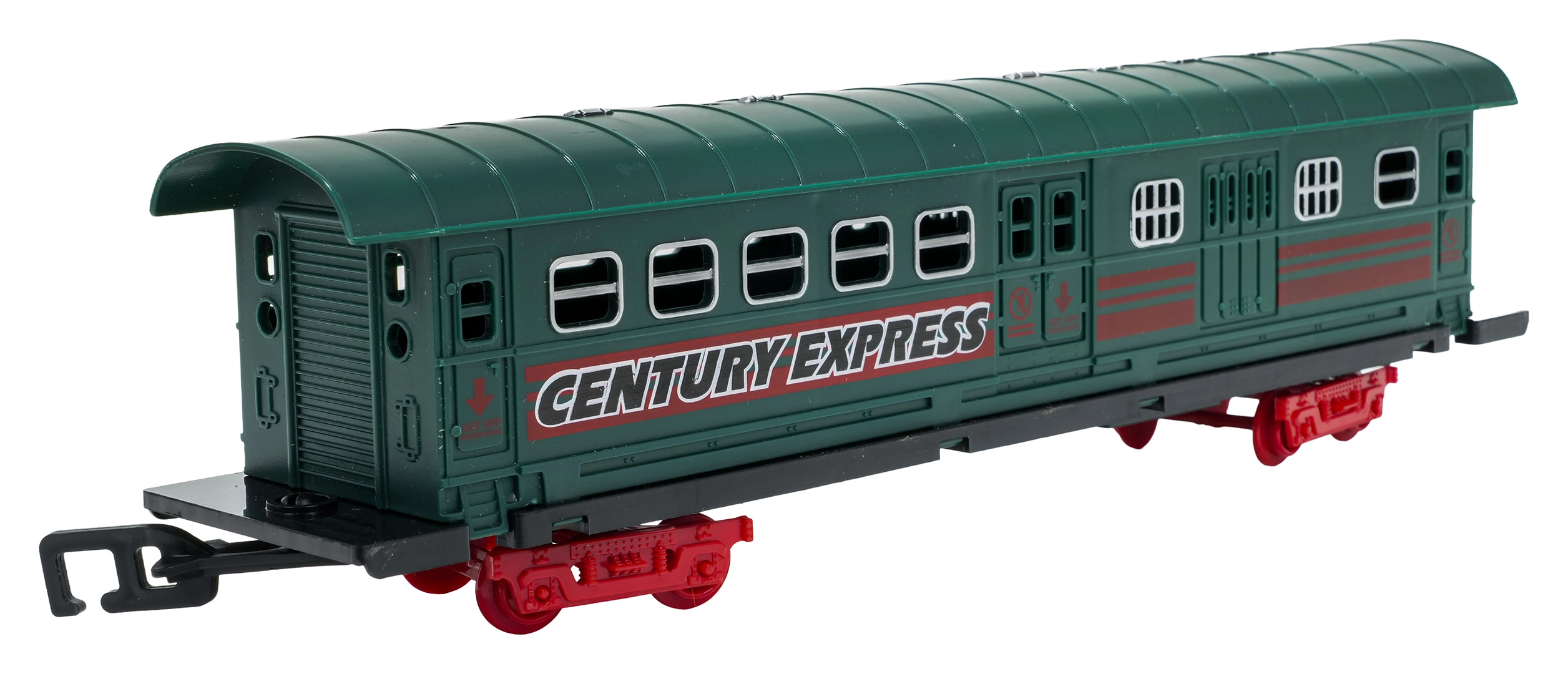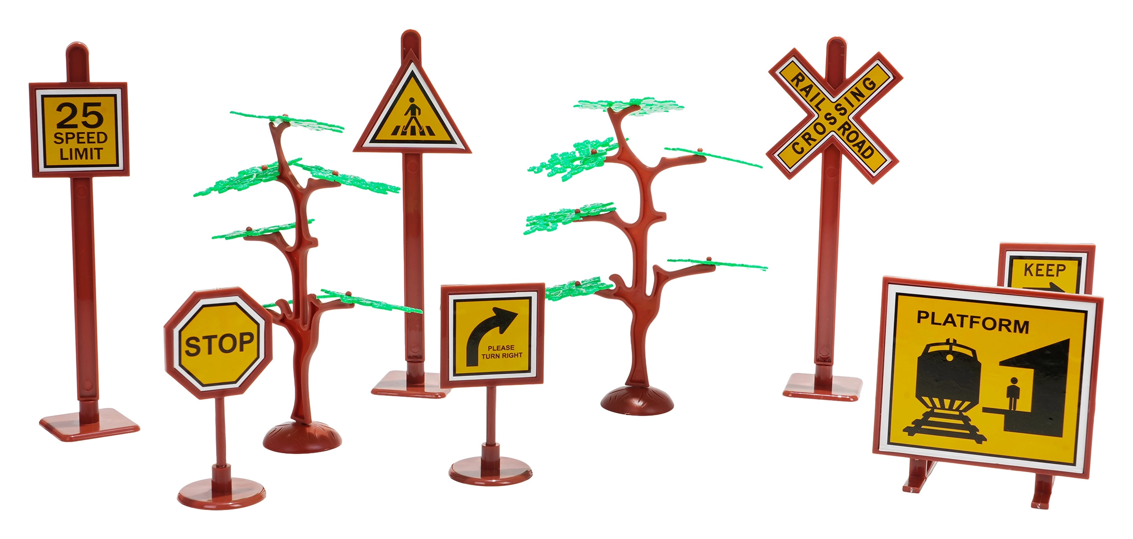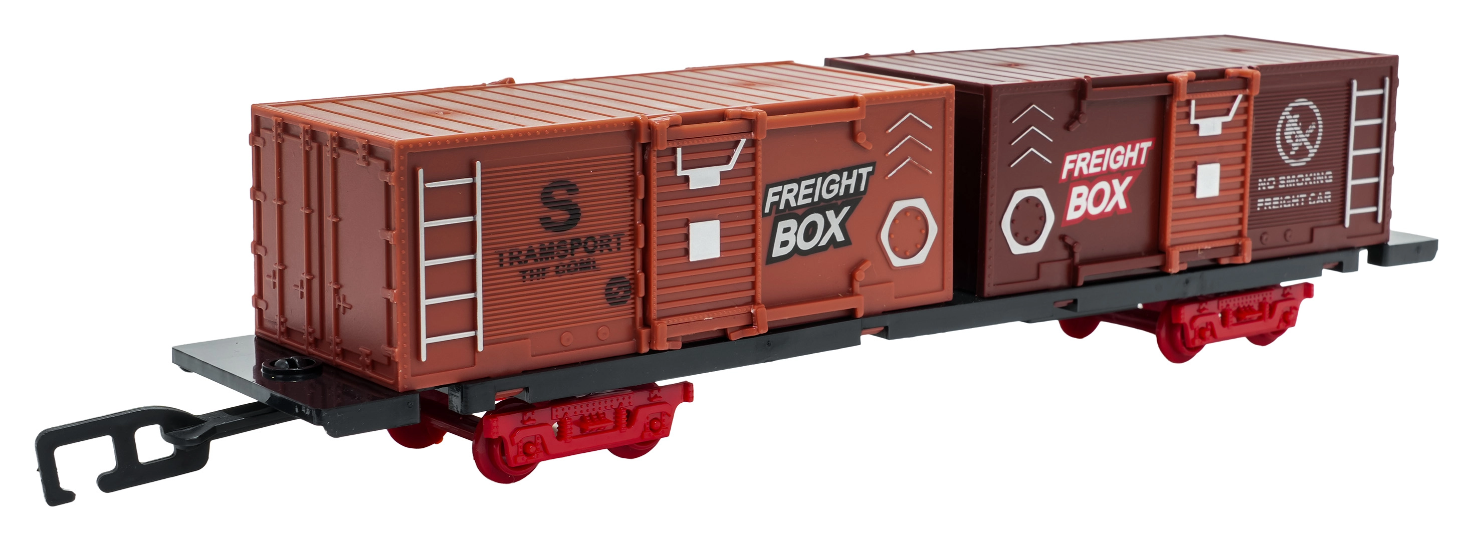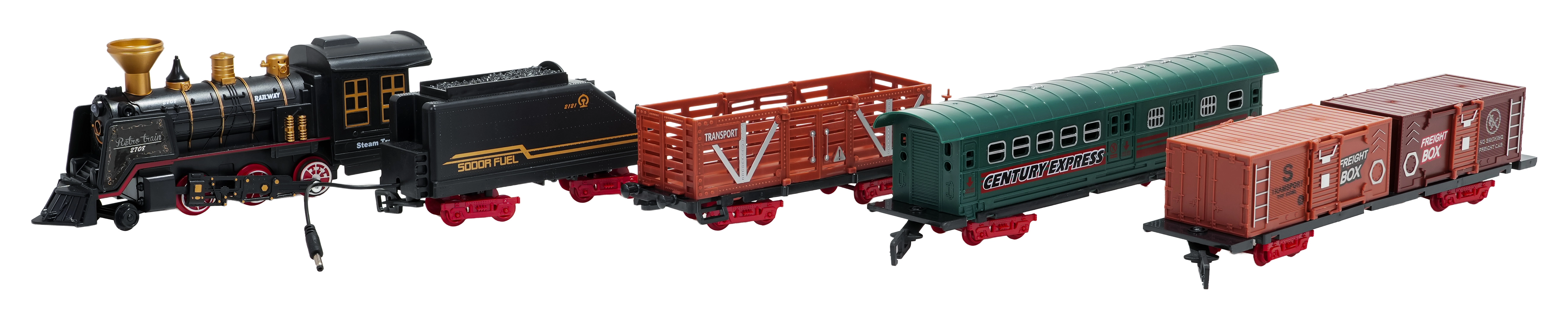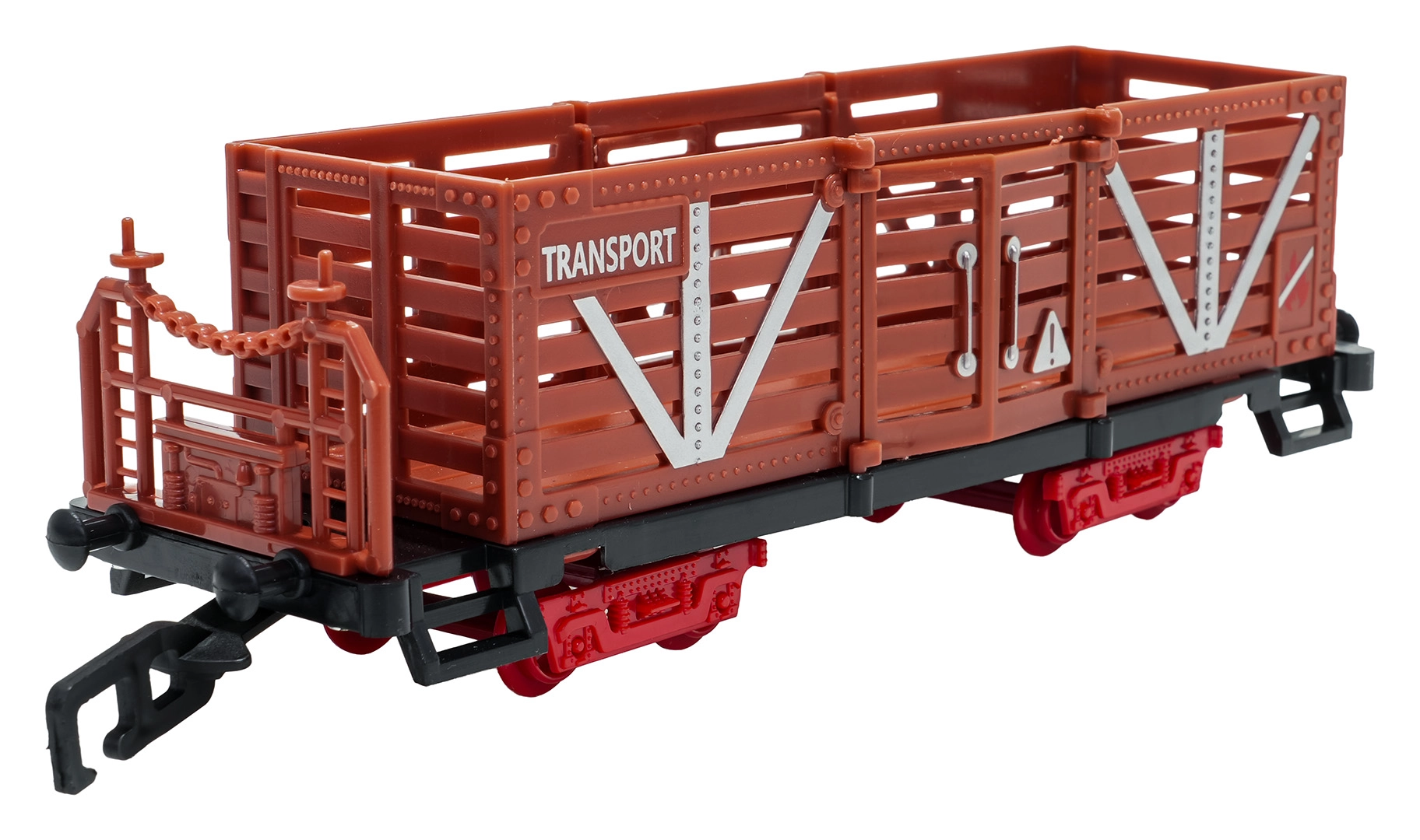 In de doos vind je een locomotief met tender, personen- en goederenwagons, borden en boompjes – alles voor creatief spelen.