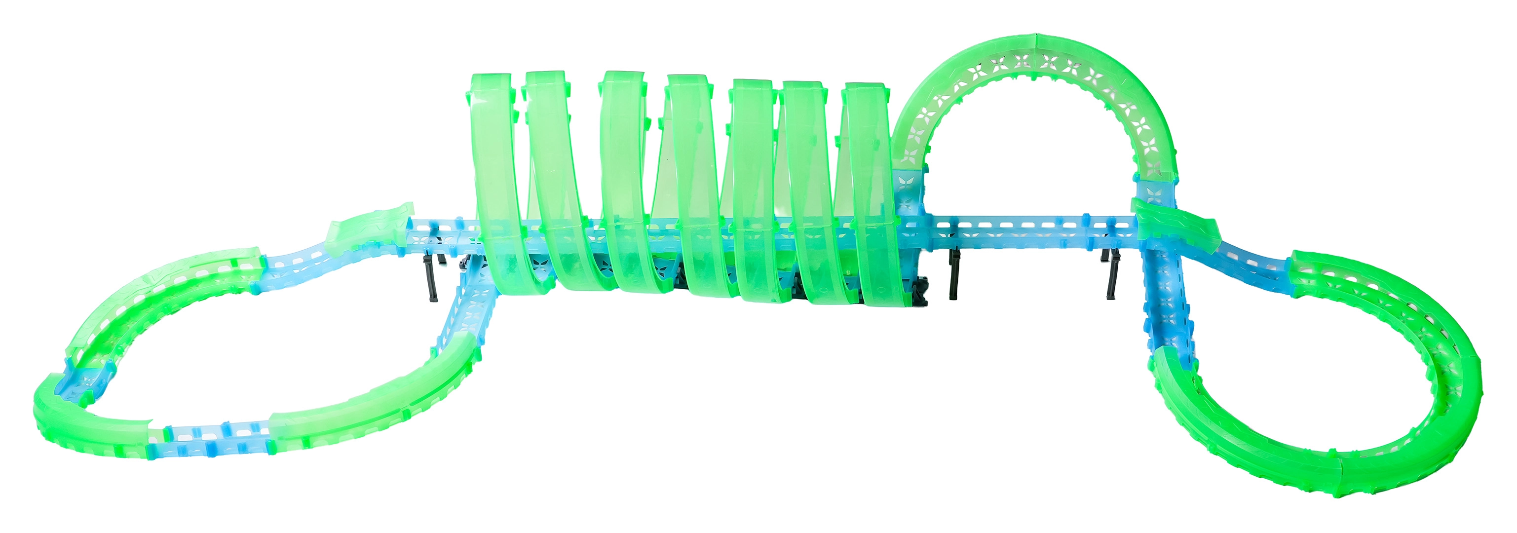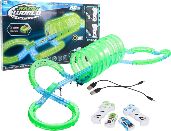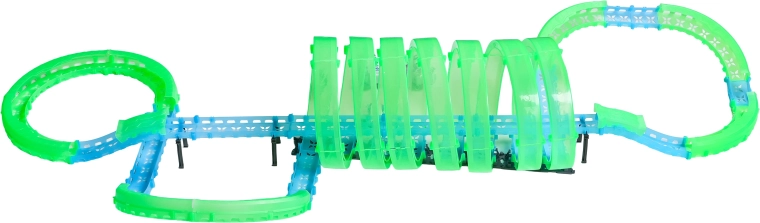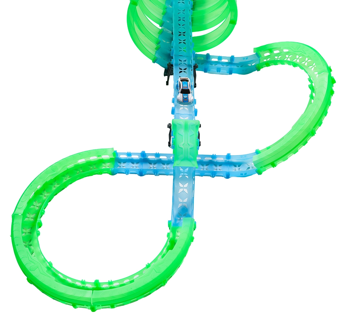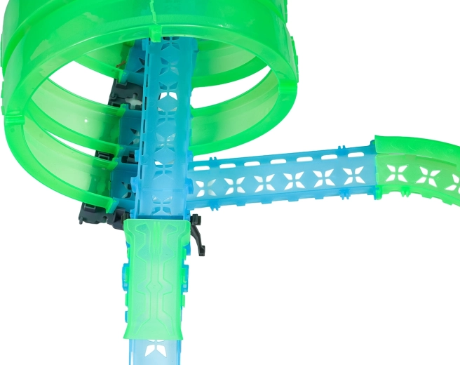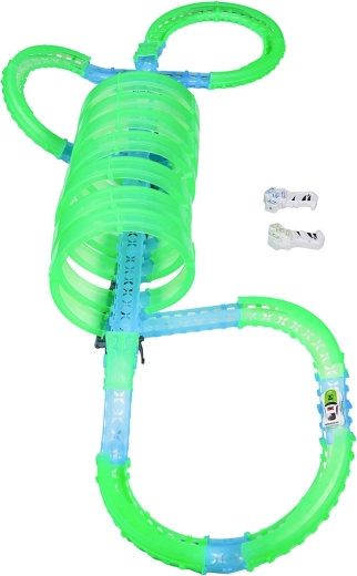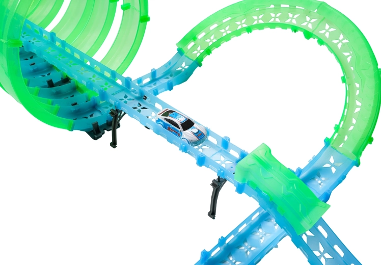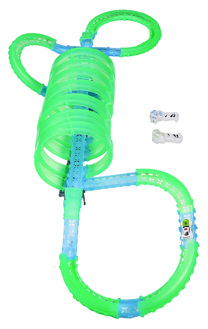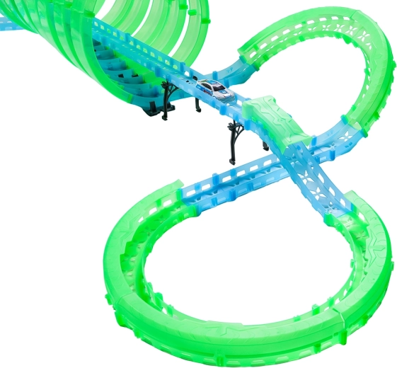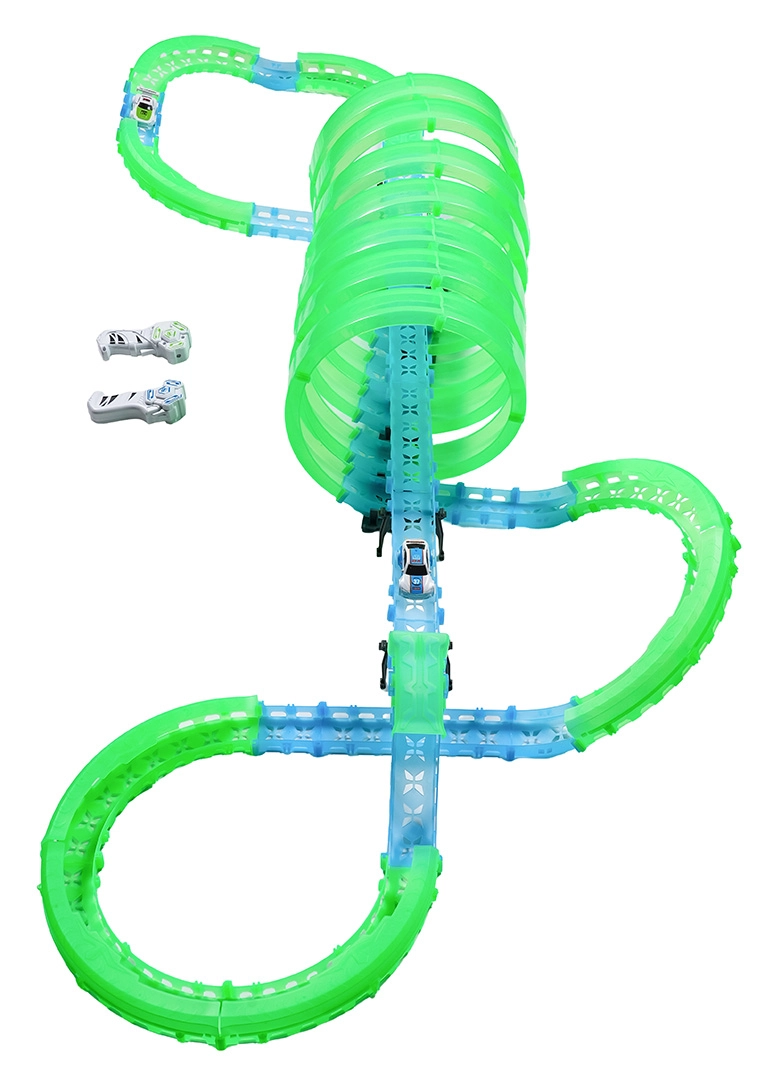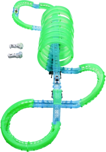 Deze modulaire racebaan van lichtgeleidend materiaal in neongroen en blauw klikt eenvoudig in elkaar en maakt snelle ombouw mogelijk. Het fluorescerende materiaal licht op na belichten en verandert samen met de LED-autootjes de kamer in een betoverende lichtarena.