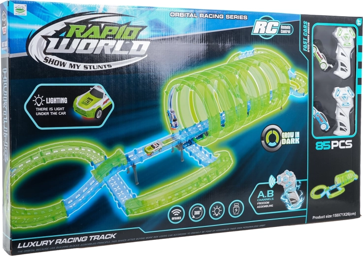 Ontdek het plezier met de lichtgevende racebaan die oplicht in het donker en razendsnelle ritten door loops en bochten biedt. In de set vind je 2 afstandsbedieningen en 2 oplaadbare autootjes met LED-verlichting die indrukwekkende lichteffecten creëren. De bouwset stimuleert creativiteit, fijne motoriek en coördinatie bij kinderen vanaf 6 jaar.