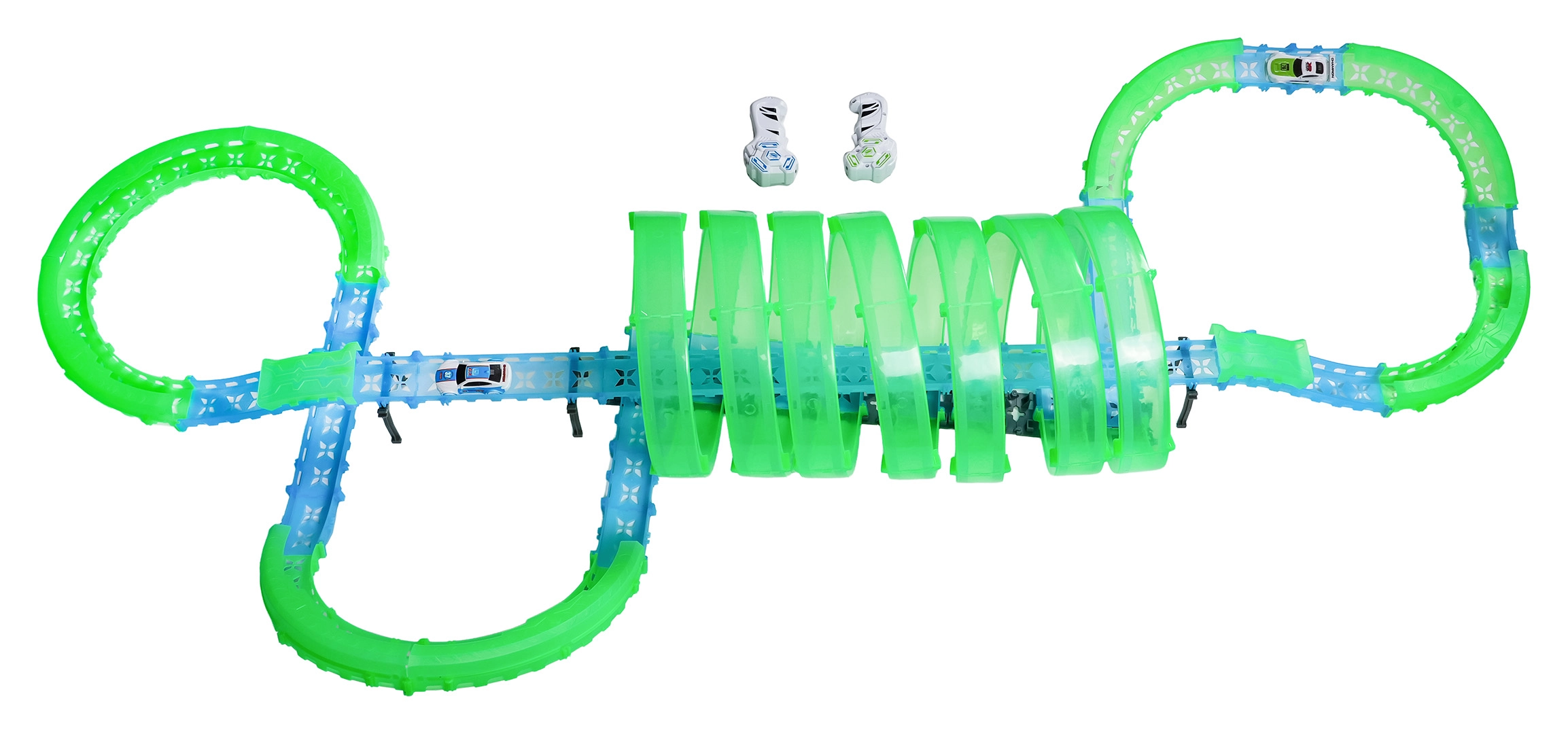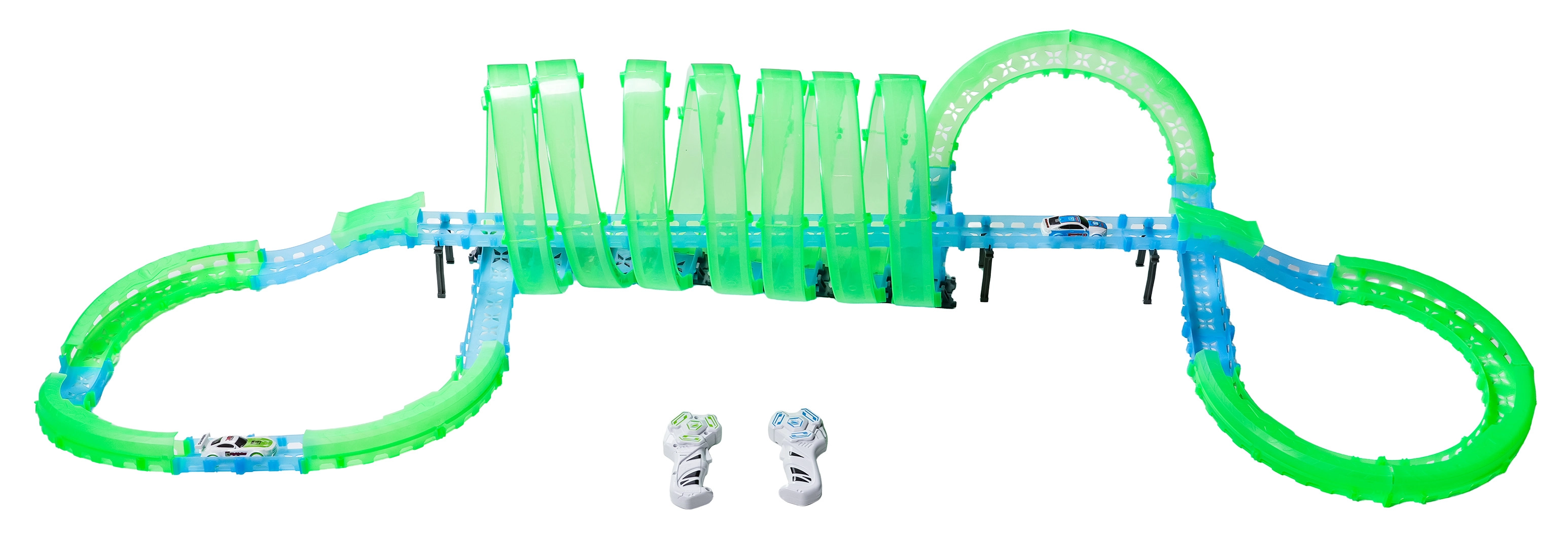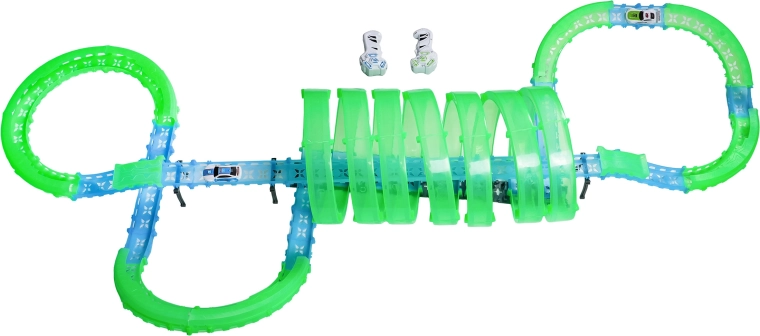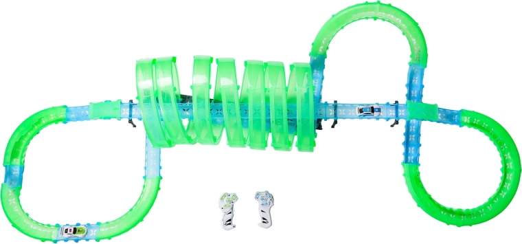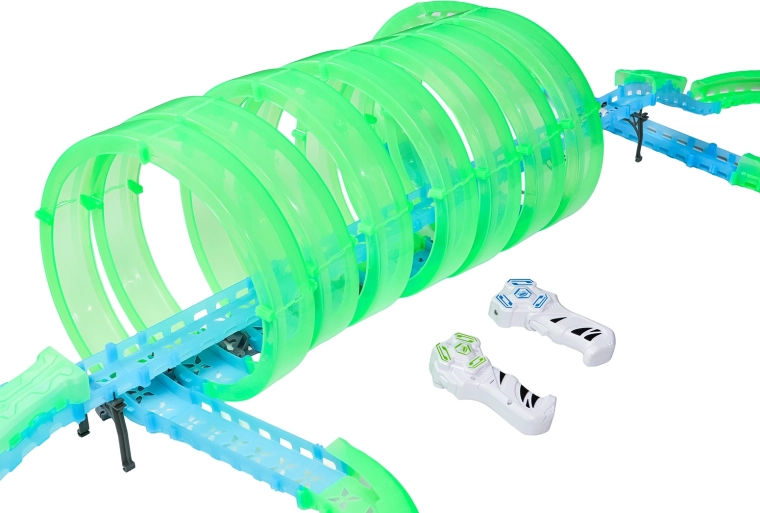Er zijn twee handbedieningen inbegrepen voor vlotte races met twee spelers. De baan bevat meerdere 360°-loops, verhoogde secties en tunneldelen voor dynamische ritten en stuntafritten.