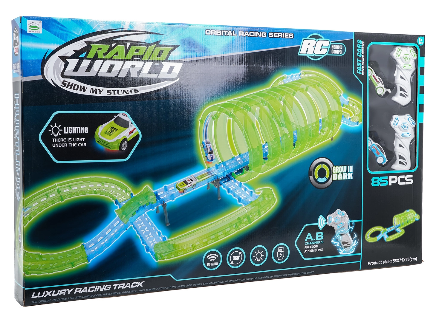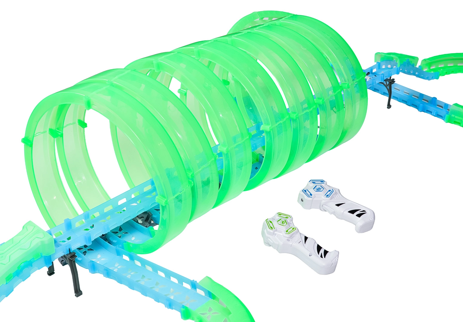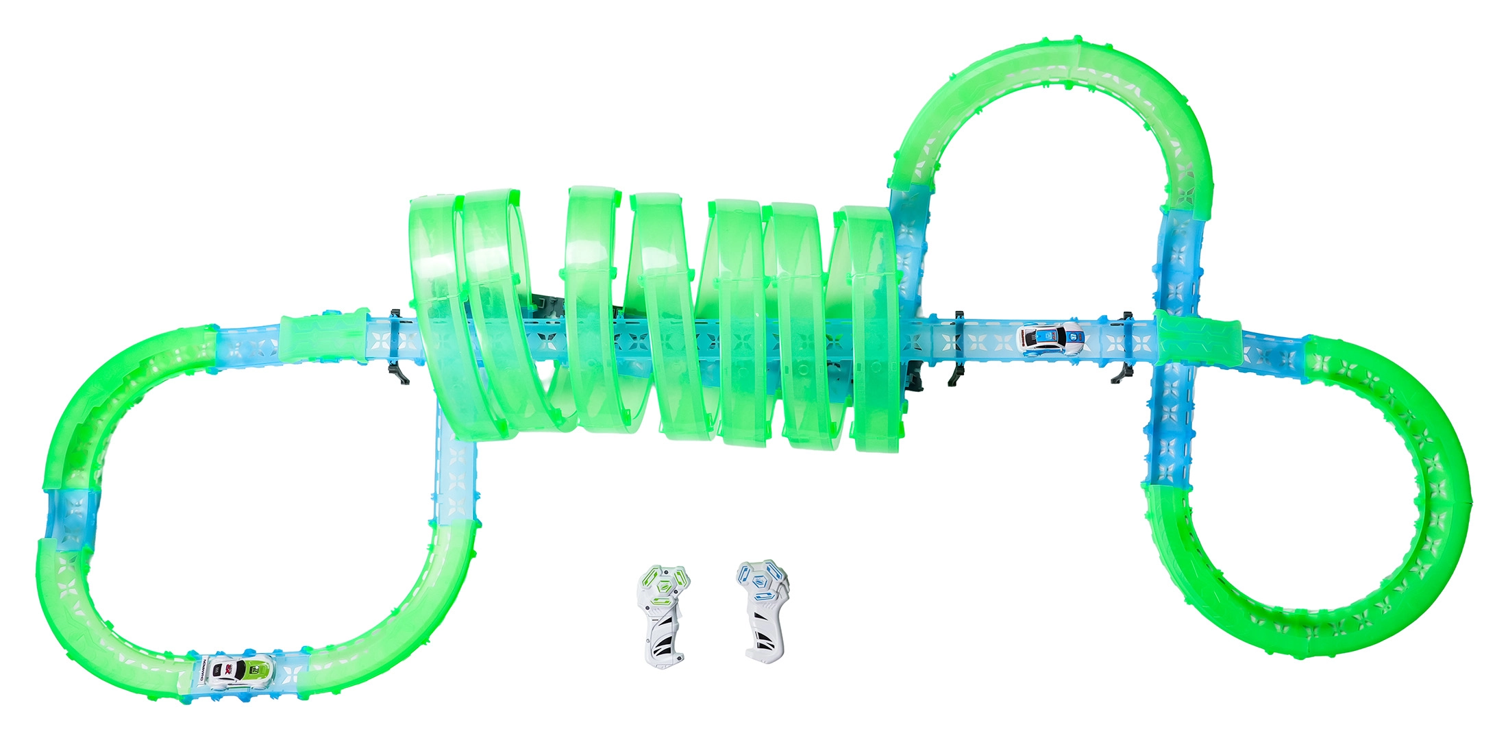 Er zijn twee handbedieningen inbegrepen voor vlotte races met twee spelers. De baan bevat meerdere 360°-loops, verhoogde secties en tunneldelen voor dynamische ritten en stuntafritten.