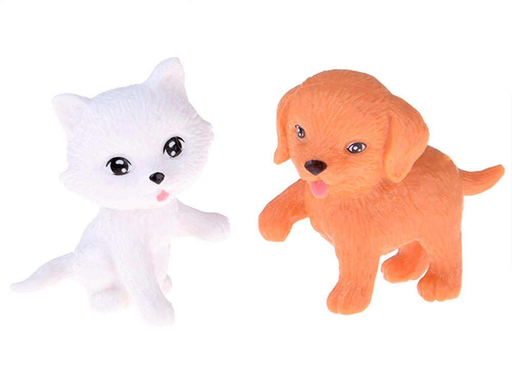 Een witte kat en een bruine hond met eigen bakjes, snacks en een bot geven elke scène extra charme en leren kinderen zorg en delen.