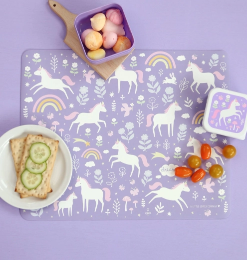 De royale afmetingen bieden voldoende ruimte voor bord, bestek en glas. Het pastelpaars met eenhoorns en regenboog laat de kindertafel schitteren en zorgt voor een vrolijke sfeer tijdens de maaltijd.