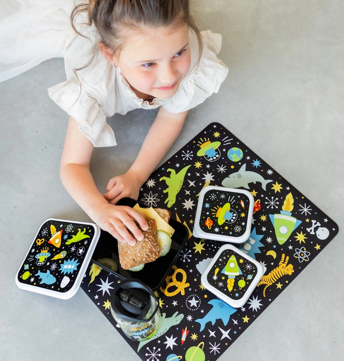 Deze zwarte vinylplacemat met ruimtethema spreekt zowel kinderen als ouders aan. Dankzij de antisliplaag blijft hij stevig op tafel liggen en het ruime formaat biedt voldoende plaats voor bord, bestek en creatieve activiteiten. Het materiaal is zeer eenvoudig schoon te maken – afnemen met een vochtige doek is voldoende.