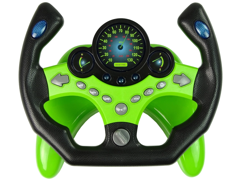 Dit groen-zwarte kinderstuurtje biedt tot 9 functietoetsen, waaronder richtingaanwijzers, claxon en geluiden van hulpdiensten. Na het omdraaien van de sleutel lichten de verlichte meters blauw op en kan de kleine bestuurder de “weg” op. De stabiele basis met zuignappen houdt het stuur stevig op het tafelblad.