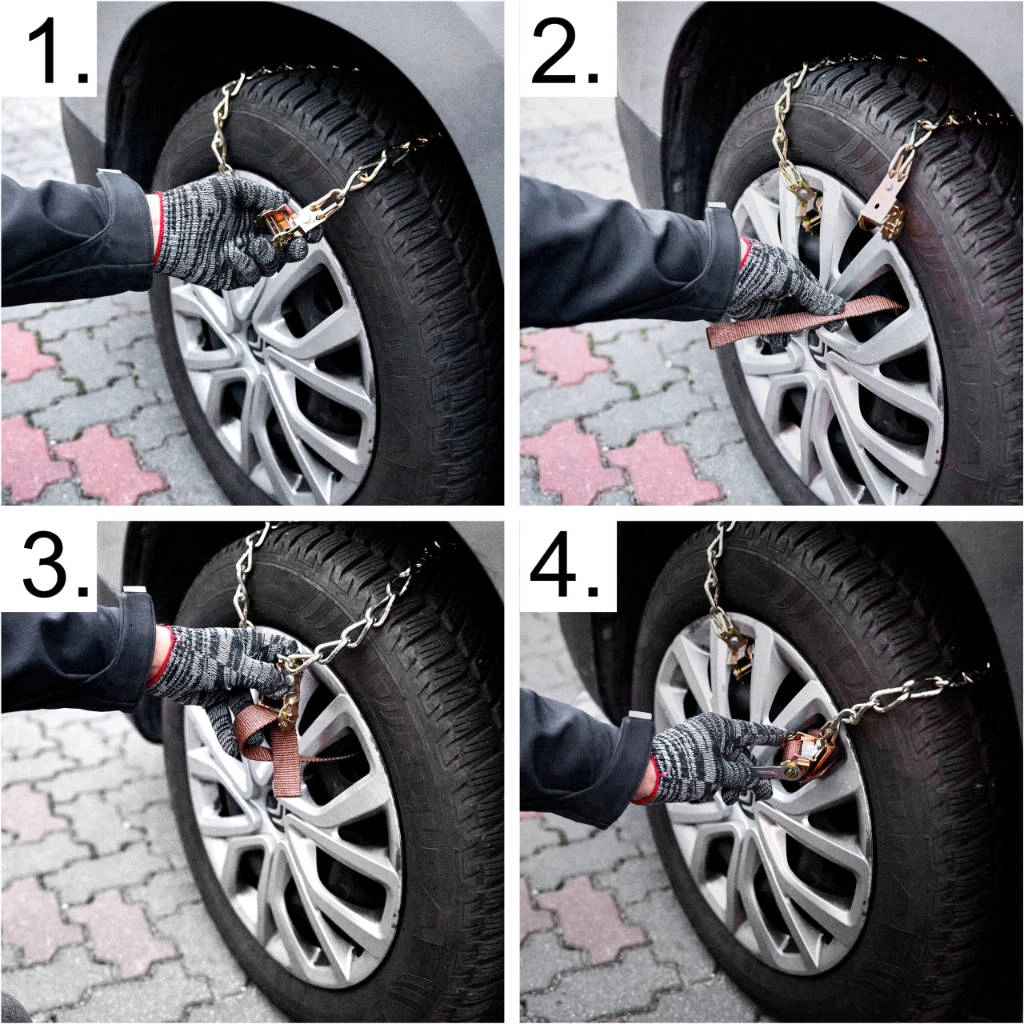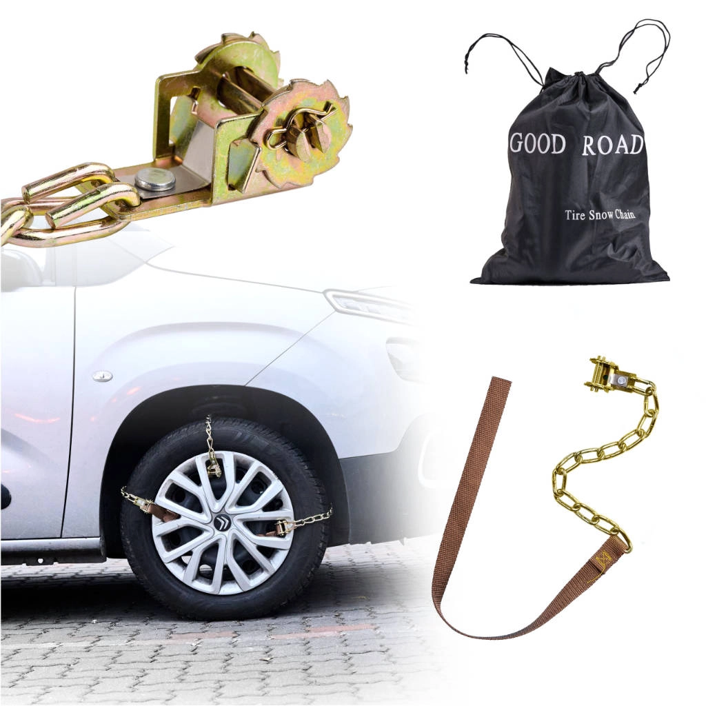 Wacht niet tot de winter je verrast. Universele sneeuwkettingen in metalen uitvoering verhogen de tractie en stabiliteit van je voertuig op besneeuwde en ijzige wegen. Dankzij de verstelbare lengte passen ze uitstekend op banden met verschillende breedtes (ca. 16,5–26,5 cm) en kun je ze snel monteren, zelfs bij ongunstig weer.