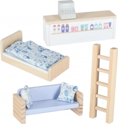 Bedje met dekentjes, bank, tafel, plank, ladder en winkelelementen creëren talloze mogelijkheden voor fantasierijk spel.